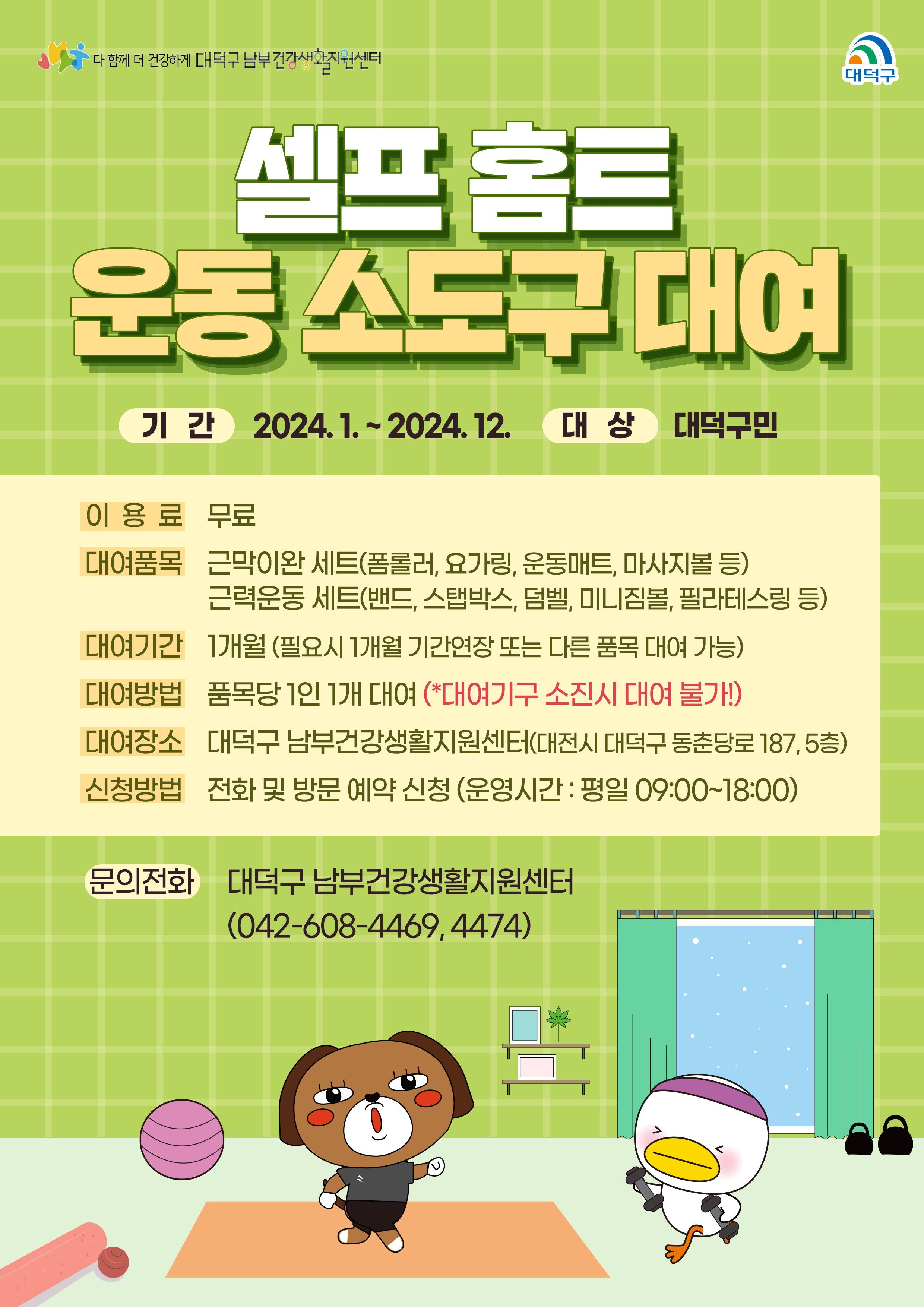 안녕하세요~ 우리마을의 건강지킴이! 대덕구 남부 건강생활지원센터입니다 오늘은 2023년부터 운영되고 있는 '셀프 홈트 운동 소도구 대여' 를 2024년에도 지속 운영하게 되어 안내해드리려고 찾아왔습니다. 시간과 장소 상관없이 집에서 간편하게 운동해보세요! 한달 대여 후 조금 더 해보고 싶으시다면 한달 재연장도 가능하고 다른 운동소도구도 대여 가능합니다. 2024년에도 나와 가족의 건강을 위하여 다 함께 운동해요!! 1. 운영기간: 2024년 연중 2. 대상: 대덕구민 3. 방법 및 신청: 1인당 운동소도구 품목 1개 무료 대여, 전화 및 방문예약 * 첨부된 카드뉴스를 자세히 읽어보시고 관심있으신 주민분들께서는 042-608-4469, 4474로 연락주세요! |