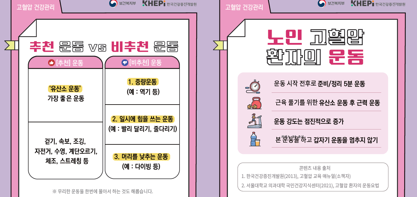 안녕하세요. 대덕구 남부건강생활지원센터 신체활동 담당자 입니다. 즐거운 추석 연휴 보내셨나요? 10월의 운동정보는 '고혈압 건강관리' 입니다. 규칙적인신체활동으로 건강하게 고혈압을 관리 할 수 있도록 첨부드린 카드 뉴스를 참고해 주시길 바랍니다. 감사합니다. (출처) 한국건강증진개발원 |
