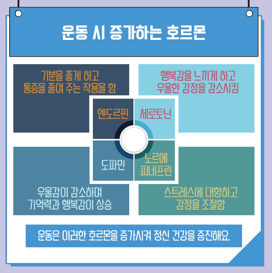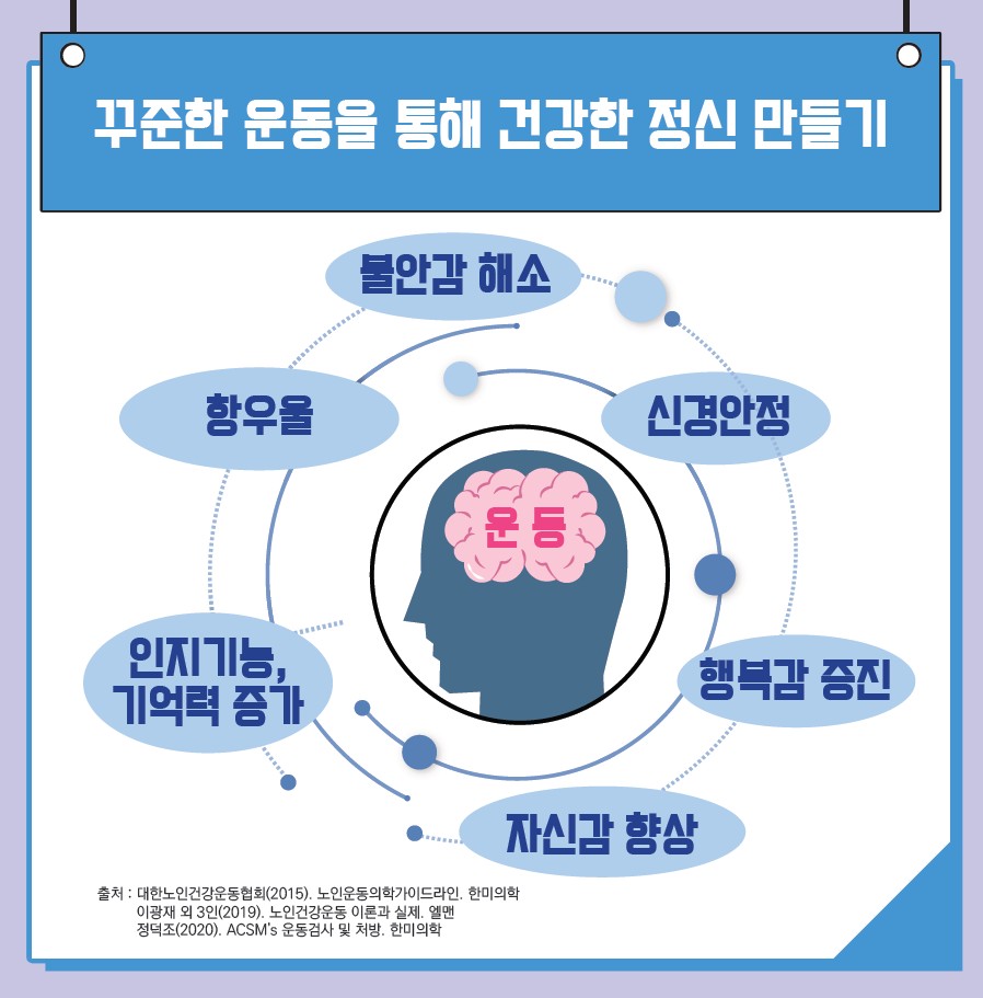 안녕하세요. 대덕구 남부건강생활지원센터 신체활동 담당자 입니다. 12월의 운동정보는 '운동으로 정신을 건강하게!' 입니다. 규칙적인신체활동으로 몸과 마음을 건강하게 관리해주세요! (출처) 한국건강증진개발원 |