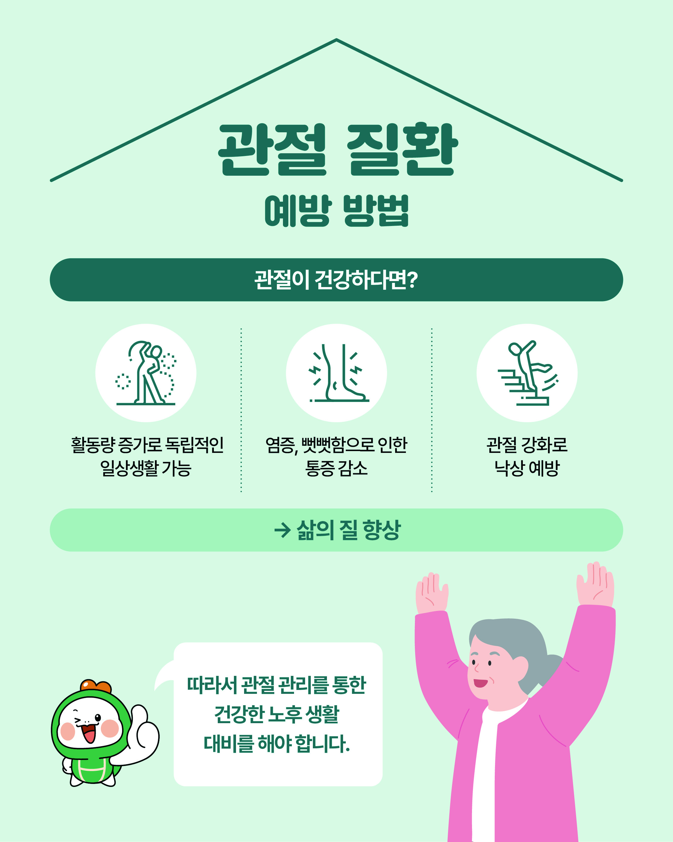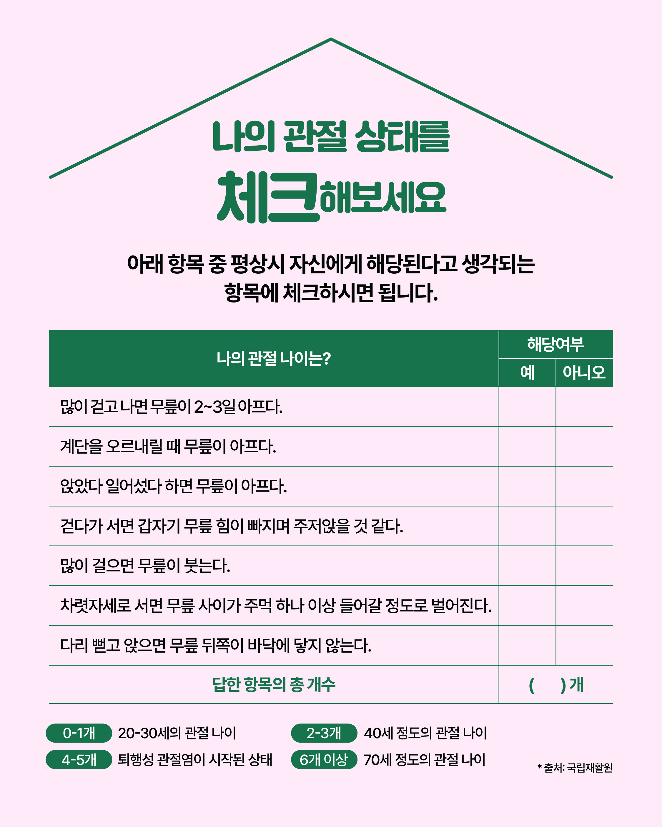 안녕하세요 대덕구 남부건강생활지원센터입니다. 2026년 1월의 운동정보는 '관절 사전예방으로 건강하게 관리 할 수 있습니다.' 입니다. 카드뉴스 맨 마지막 페이지의 운동 방법을 참고하시어 본인의 체력 수준에 맞춰 운동을 진행해주시면 좋을 것 같습니다. 추운 겨울철 실내에서 안전하게 근력운동을 실천하셔서 관절을 튼튼하게 관리해주시길 바랍니다. 감사합니다. (출처) 한국건강증진개발원 |