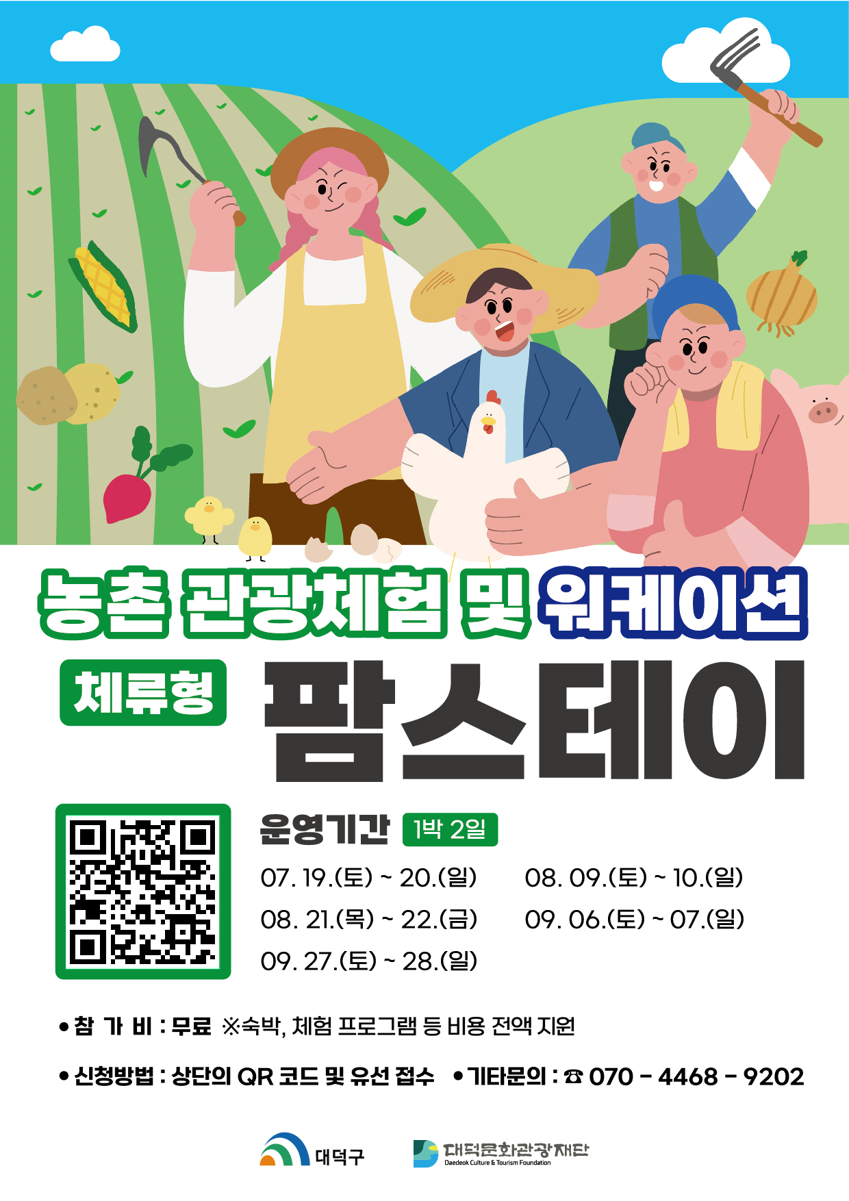• 2025 대덕구 팜스테이 참여자 모집(5회차) 이미지1 2025 대덕구 팜스테이 참여자 모집(5회차) 이미지2 2025 대덕구 팜스테이 참여자 모집(5회차) 이미지3 도시를 벗어나, 대덕에서 쉬어가기!