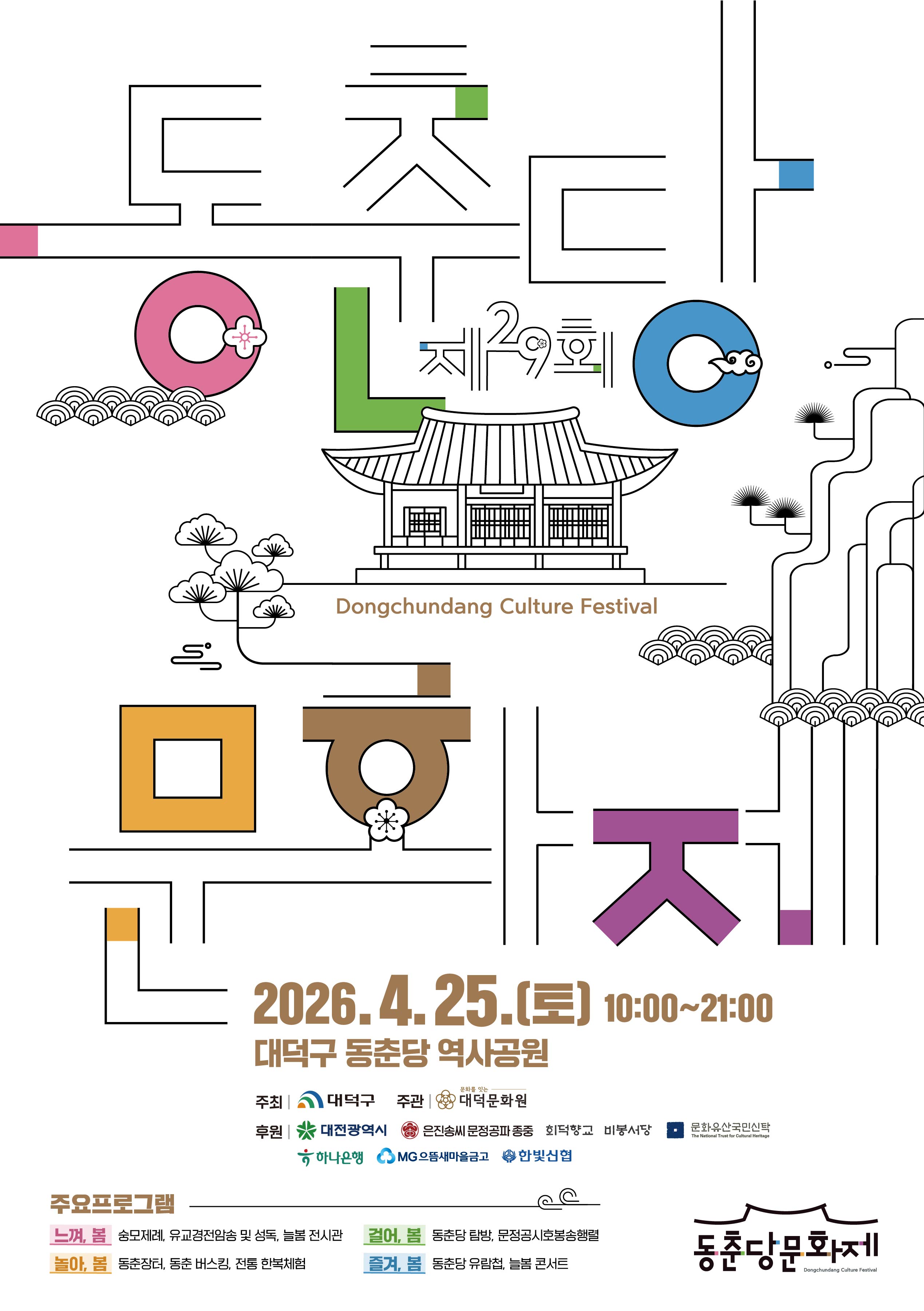 제29회 동춘당문화제를 다음과 같이 개최하오니, 많은 관심과 참여 바랍니다. ○ 일시: 2026. 4. 25.(토) 10:00 ~ 21:00 ○ 장소: 대덕구 동춘당역사공원 일원 ○ 주최/주관: 대덕구 / 대덕문화원, 회덕향교 ○ 문의: 대덕문화원(042-627-7517) ○ 주요 프로그램 - 동춘 장터 (시 간) 10:00~20:00 (장 소) 동춘당역사공원 원형마당, 동춘당 마당, 동춘당 출입문 맞은편 (내 용) 체험, 먹거리, 전시 부스, 거리공연 등 - 인물 전시관 (시 간) 10:00~20:00 (장 소) 동춘당 출입문 맞은편 (내 용) 동춘당 송준길 선생과 동춘당에 대한 체험 및 전시 - 숭모제례 (시 간) 10:30~11:30 (장 소) 동춘당 (내 용) 동춘당 송준길 선생을 기리는 전통 유교식 제례 행사 - 유교경전암송 (시 간) 11:30~12:30 (장 소) 동춘당 (내 용) 동춘당 송준길의 유교정신을 받드는 청소년 유교 경전 암송 - 역사문화탐방 (시 간) 14:00~18:00 / 4회차(회차당 40분 소요) (장 소) 동춘당, 별묘, 종택, 송씨3세효자정려구허비, 금암, 소대헌·호연재 고택, 호연재 시비 (내 용) 동춘당역사공원 내 유적·문화재 탐방 - 동춘 버스킹 (시 간) 15:00~18:00 / 3회차(회차당 40분 소요) (장 소) 동춘당역사공원 원형마당 (내 용) 문화예술 전문공연 팀 버스킹 - 문정공시호봉송행렬 (시 간) 18:00~18:50 (장 소) 법동초등학교에서 출발하여 동춘당역사공원에서 종료 (내 용) 문정공 시호 교지를 받아 오는 행렬 재현 - 늘봄 콘서트 (일 시) 19:00~20:30 (장 소) 동춘당역사공원 원형마당 (내 용) 주민 화합 문화예술 공연 -기타: 무료 한복 체험(10:00~17:00 / 소대헌·호연재 고택 / 문화유산국민신탁), 시낭송(16:30~17:30 / 소대헌·호연재 고택 / 대덕시낭송회) |