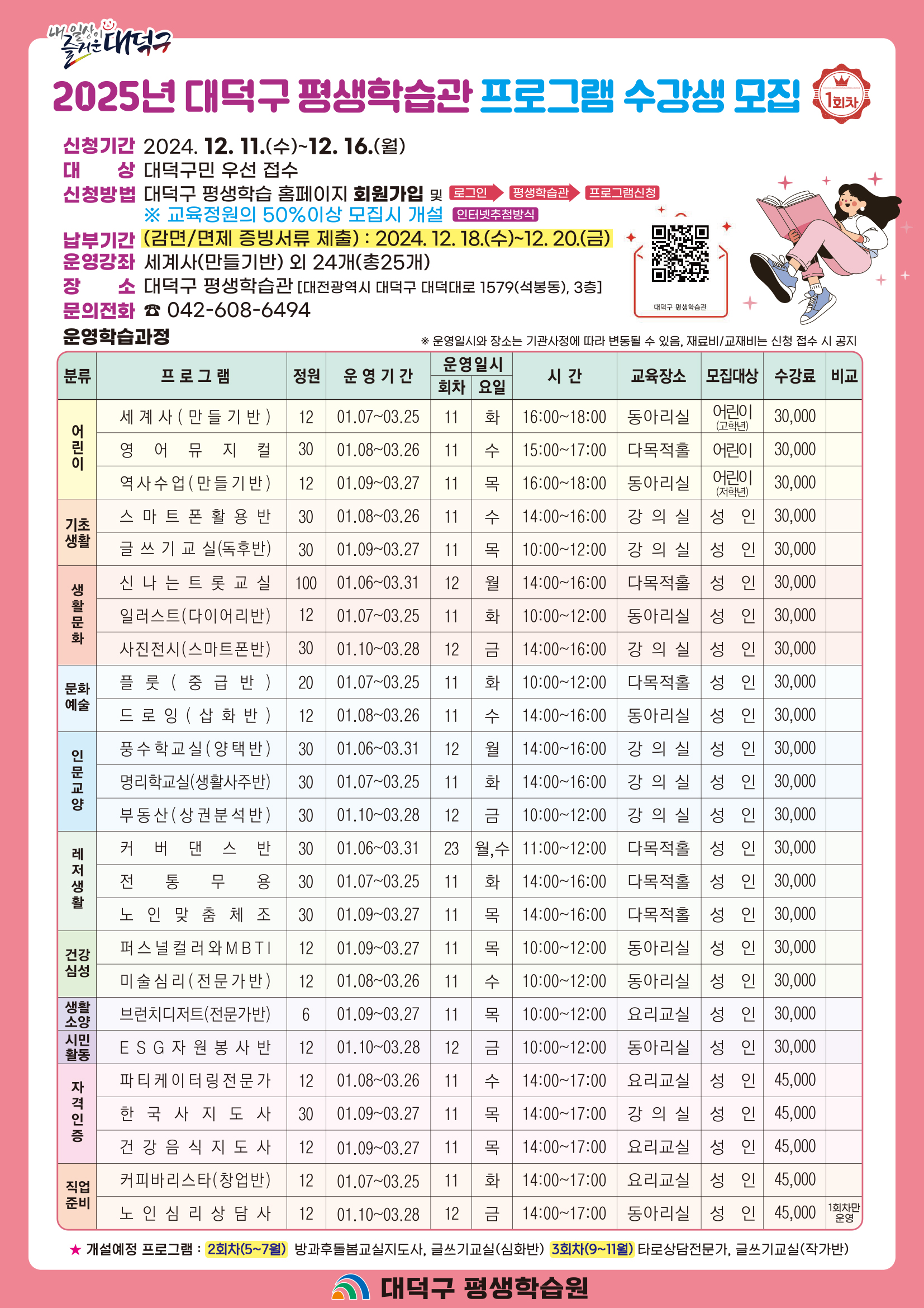 1. 대전 대덕구, 2025년 1회차 평생학습 프로그램 수강생 모집.hwp(82.5KB) 1. 대전 대덕구, 2025년 1회차 평생학습 프로그램 수강생 모집.jpg(1.7MB) |