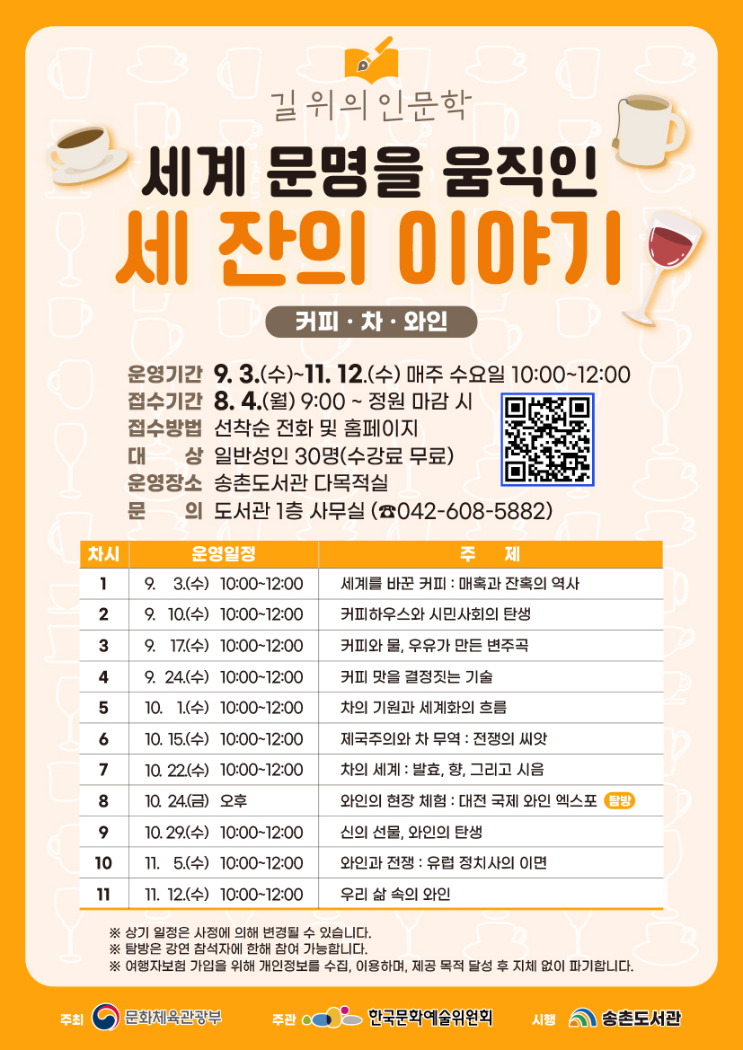 대전 대덕구 송촌도서관, 2025년 ‘길 위의 인문학’ 운영 ‘세계 문명을 움직인 세 잔의 이야기 : 커피, 차, 와인’ 주제 선착순 30명 모집… 오는 9월 3일부터 11월 12일까지 진행 대전 대덕구(구청장 최충규)는 오는 9월 3일부터 11월 12일까지 송촌도서관에서 ‘2025년 길 위의 인문학 프로그램’을 운영한다고 3일 밝혔다. 길 위의 인문학 프로그램은 문화체육관광부가 주최하고 한국문화예술위원회가 주관하는 공공 인문학 사업으로, 시민들의 인문학적 삶의 질 향상을 도모하는 대표적인 생활 밀착형 인문학 프로그램이다. 송촌도서관은 총 11회에 걸쳐 ‘세계 문명을 움직인 세 잔의 이야기 : 커피, 차, 와인’을 주제로 강연을 진행한다. 특히 단순히 음료를 이야기하는 데 그치지 않고, 인류 역사 속에서 음료가 지닌 의미와 음료가 어떻게 인간의 역사와 사회, 권력 구조와 일상에 영향을 미쳐왔는지를 다양한 각도에서 탐색할 예정이다. 강의는 정명기 한남대학교 명예교수와 커피 전문 교육기관의 대표 성효미 강사가 참여하며, 단순한 강연에 그치지 않고, 시음과 실습, 탐방 등 다채로운 활동을 통해 인문학적 통찰을 직접 체험할 수 있도록 할 계획이다. 프로그램 참여를 원하는 경우, 대덕구 송촌도서관 홈페이지 또는 전화(☏608-5882)로 선착순 신청할 수 있다. 수강료는 무료다. 최충규 대덕구청장은 “인문학은 우리가 마시는 음료처럼 가까운 일상에서 시작할 수 있다”라며 “이번 송촌도서관 길 위의 인문학 프로그램을 통해 우리 주민들이 문화적 감수성과 소통의 기쁨을 함께 나누길 바란다”고 전했다. [사진 설명 : 송촌도서관 2025년 길 위의 인문학 홍보 포스터] |