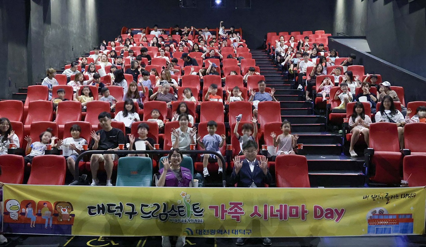 “함께해서 행복한 시간” 대전 대덕구 드림스타트, ‘가족 시네마 Day’ 대전 대덕구(구청장 최충규)는 드림스타트 아동과 가족 160여 명과 ‘가족 시네마 Day’ 프로그램을 운영했다고 3일 밝혔다. ‘가족 시네마 Day’ 프로그램은 여름방학을 맞은 드림스타트 아동과 가족에게 영화 관람의 기회를 제공하고, 가족 간 친밀감 형성하고자 마련됐다. 구는 이날 CGV 대전터미널점 1개 관을 대관해 가족들이 함께 애니메이션 ‘배드가이즈 2’를 관람할 수 있도록 했다. 최충규 대덕구청장은 “우리 지역의 아동들과 가족들이 무더위와 스트레스로 지친 일상에서 벗어나 함께 즐겁게 보내길 바란다”며 “앞으로도 가족이 함께할 수 있는 다양한 문화 체험 행사를 마련하겠다”고 전했다. 한편, 대덕구 드림스타트는 취약계층 0~12세(초등학생) 이하 아동과 가족을 대상으로 건강한 가족관계를 유지하고 긍정적 사고로 행복하게 성장하도록 지원하기 위해 아동통합사례관리와 맞춤형 서비스 프로그램을 제공하고 있다. [사진 설명: 최충규 대덕구청장(사진 첫 번째 줄 왼쪽 두 번째)과 대덕구 드림스타트 가족들이 2일 CGV 대전터미널점에서 영화를 관람하기 전 기념 촬영을 하고 있다.] |