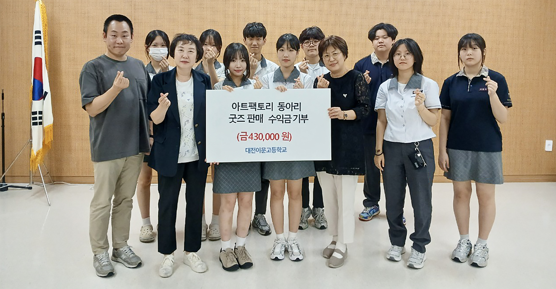 이문고등학교 아트팩토리 동아리, 대전 대덕구 석봉동에 이웃돕기 성금 기탁 멸종위기 생물 주제 굿즈 제작·판매 수익금 43만원 전달 대전 대덕구 석봉동은 이문고등학교(교장 이재홍) 미술동아리 ‘아트팩토리’가 이웃 사랑 실천을 위해 행사 수익금 43만원을 기탁했다고 밝혔다. 이번 기탁은 아트팩토리 동아리 학생들이 지난 7월 교내에서 기후 위기와 생물다양성 문제에 대한 인식을 확산하고자 멸종위기 생물을 주제로 키링, 스티커, 손거울 등 굿즈를 제작, 판매해 얻은 수익금으로 마련됐다. 석봉동 행정복지센터는 기탁받은 성금을 활용해 지역의 어려운 이웃을 위해 백미 또는 라면을 구입해 전달할 예정이다. 박정욱 석봉동장은 “우리 지역의 학생들이 굿즈를 만들고 판매해 얻은 소중한 수익금을 지역의 어려운 이웃들에게 잘 전달하겠다”며 “앞으로도 나눔과 책임을 실천하는 인재로 성장하길 바란다”고 말했다. [사진 설명 : 박정욱 석봉동장(사진 왼쪽 두 번째)과 이문고등학교 미술동아리 ‘아트팩토리’ 학생들이 멸종위기 생물 굿즈 판매 수익금 기탁식을 마친 후 기념 촬영을 하고 있다.] |