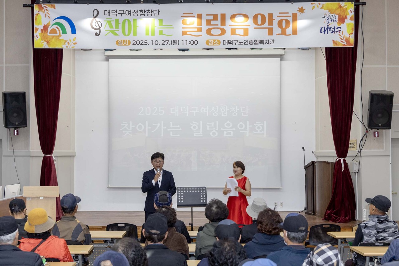 가을빛 선율로 만난 이웃… 대전 대덕구 여성합창단 ‘찾아가는 힐링음악회’ 문화의 달 맞아 감미로운 합창 선율로 휴식·감동 선사 세대 공감 무대 호평… 오는 11월 27일 정기연주회로 감동 이어가 대전 대덕구(구청장 최충규)는 27일 대덕구노인종합복지관에서 열린 대덕구 여성합창단의 ‘찾아가는 힐링음악회’가 성황리에 마무리됐다고 밝혔다. 깊어 가는 가을 정취에 어울리는 레퍼토리로 구성된 이번 공연은 바쁜 일상 속 구민에게 휴식과 감동을 선사했다. 무대는 구은서 지휘자의 섬세한 해석과 김정은 반주자의 탄탄한 피아노가 더해져 완성도를 높였다. 또한 시곡(詩曲) 합창과 듀엣 등 세대 공감 프로그램으로 호응을 이끌었다. 최충규 대덕구청장은 “합창에 대한 열정과 정성으로 이번 힐링음악회를 준비해 주신 대덕구 여성합창단에 감사드린다”며 “앞으로도 일상 가까이에서 문화예술을 누릴 수 있도록 힘써주시길 바란다”고 말했다 한편, 2002년 창단한 대덕구 여성합창단은 지역 대표 여성 합창단으로 꾸준히 활동해 왔으며, 오는 11월 27일 오후 7시 30분, 한남대학교 서의필홀에서 제23회 정기연주회를 열어 가을의 감성을 이어갈 예정이다. [사진 설명(1) : 최충규 대덕구청장이 27일 대덕구노인종합복지관에서 열린 대덕구 여성합창단의 ‘찾아가는 힐링음악회’에 참석해 주민들에게 인사를 전하고 있다.] [사진 설명(2) : 대덕구 여성합창단원들이 27일 대덕구노인종합복지관에서 열린 ‘찾아가는 힐링음악회’서 무대를 꾸미고 있다.] |