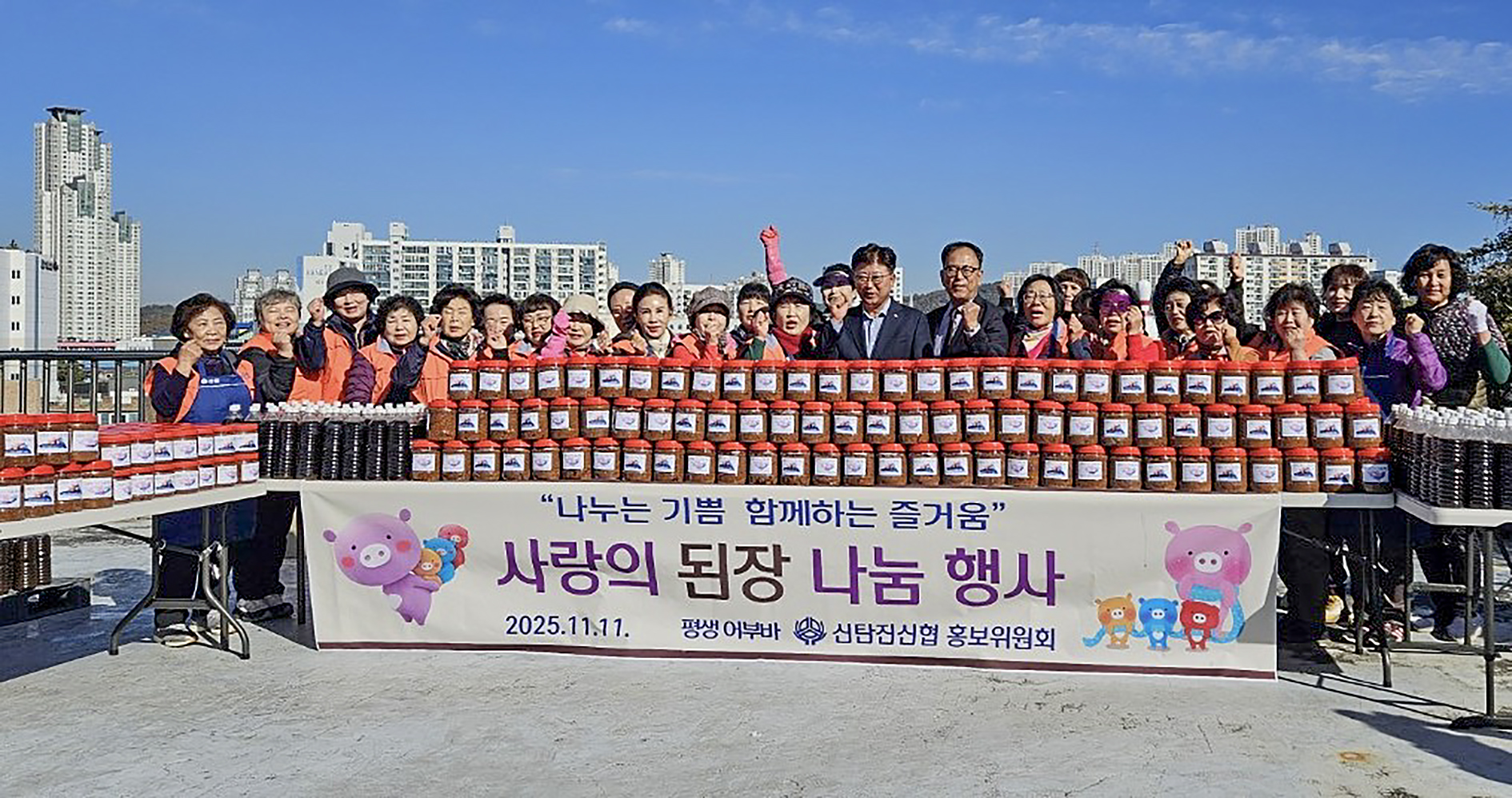 신탄진신협, 대전 대덕구 신탄진 권역 4개 동에 ‘사랑의 된장’ 전달 홍보위원 30여 명 참여… 봄에 담근 수제 된장, 취약가구 200곳에 포장·전달 대전 대덕구 덕암동(동장 홍경철)은 신탄진신협(이사장 박천영)이 신탄진 권역 4개 동(덕암동·신탄진동·석봉동·목상동)의 어려운 이웃을 돕기 위해 ‘사랑의 된장 나누기’ 행사를 열었다고 밝혔다. 이날 덕암동 소재 신탄진신협 본관 옥상에서 열린 행사에는 홍보위원 30여 명이 참여한 가운데 봄부터 담가 숙성시킨 된장을 직접 포장해 저소득, 홀몸 어르신, 장애 가정 등 취약가구 200곳에 전달했다. 박천영 신탄진신협 이사장은 “정성으로 만든 된장이 이웃들에게 작은 힘이 되길 바란다”며 “앞으로도 지역과 함께 성장하는 신협으로서 나눔을 이어가겠다”고 말했다. 홍경철 덕암동장은 “추운 날씨에도 아침 일찍부터 봉사에 나선 신탄진신협 홍보위원들의 따뜻한 마음에 감사드린다”며 “작은 나눔이 큰 행복으로 이어지도록 주민 참여의 장을 넓혀가겠다”고 전했다. 한편 신탄진신협은 매년 봄 ‘사랑의 고추장 나눔’, 겨울 ‘된장 나누기’를 이어오며 지역의 취약계층을 지원하고 있다. [사진 설명(1) : 신탄진신협 홍보위원들이 11일 신탄진 권역 4개 동(덕암동·신탄진동·석봉동·목상동)의 어려운 이웃을 돕기 위한 사랑의 된장 나누기 행사를 진행하고 있다.] [사진 설명(2) : 신탄진신협 홍보위원들이 11일 신탄진 권역 4개 동(덕암동·신탄진동·석봉동·목상동)의 어려운 이웃을 돕기 위한 사랑의 된장 나누기 행사를 마친 후 최충규 대덕구청장과 기념 촬영을 하고 있다.] |