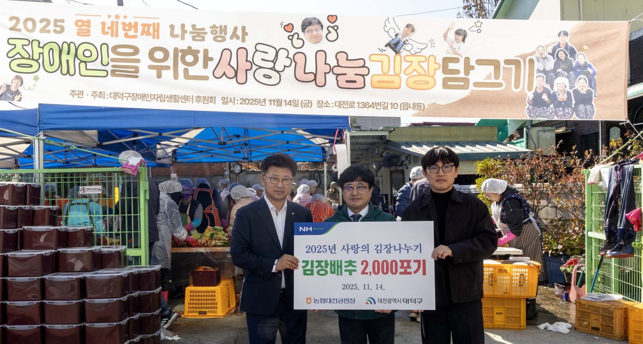 대전 대덕구 장애인자립생활센터, 3000포기 김장 담가 이웃에 온정 전달 사랑 나눔 김장 담그는 날 개최… 자원봉사자 100여 명 동참해 농협대전공판장 배추 2000포기 후원… 도지역사회 나눔·포용 문화 확산 대전 대덕구(구청장 최충규)는 14일 대덕구장애인자립생활센터(대표 문선우)가 ‘2025년 사랑 나눔 김장 담그는 날’ 행사를 열고 지역사회 나눔 문화를 확산했다고 밝혔다. 이번 행사에는 센터 직원 15명과 자원봉사자 100여 명이 참여해 3000포기의 김장김치를 담그며 온정을 나눴다. 특히 농협대전공판장(사장 박지훈)이 배추 2000포기를 후원해 행사 의미를 더했다. 이날 담근 김장김치는 중증장애인, 홀몸 어르신, 한부모가정 등 직접 김장을 준비하기 어려운 취약계층 500세대에 전달될 예정이다. 문선우 대덕구장애인자립생활센터 대표는 “추운 겨울일수록 서로를 돌아보는 마음이 필요하다”며 “정성으로 담근 김치가 이웃들에게 따뜻한 힘이 되길 바란다”고 말했다. 최충규 대덕구청장은 “이번 김장 나눔이 어려운 이웃에게 따뜻함을 전하는 뜻깊은 시간이 되길 바란다”며 “앞으로도 지역사회 복지 향상과 나눔 문화 확산을 위해 지속적인 관심과 지원을 아끼지 않겠다”고 강조했다. 한편 대덕구장애인자립생활센터는 동료상담, 자립지원, 권익옹호 등 장애인의 자립과 삶을 지원하는 다양한 활동과 장애인과 비장애인이 함께 어울리는 포용적 문화 확산에 힘쓰고 있다. [사진 설명(1),(2) : 최충규 대덕구청장이 14일 대덕구장애인자립생활센터 ‘2025년 사랑 나눔 김장 담그는 날’ 행사에 참석해 센터 직원 및 자원봉사자들과 함께 김장김치를 담그고 있다.] [사진 설명(3) : (사진 왼쪽부터) 최충규 대덕구청장과 문선우 대덕구장애인자립생활센터 대표, 이동혁 농협대전공판장 부장장이 ‘2025년 사랑 나눔 김장 담그는 날’ 행사에 참석해 기념 촬영을 하고 있다.] |