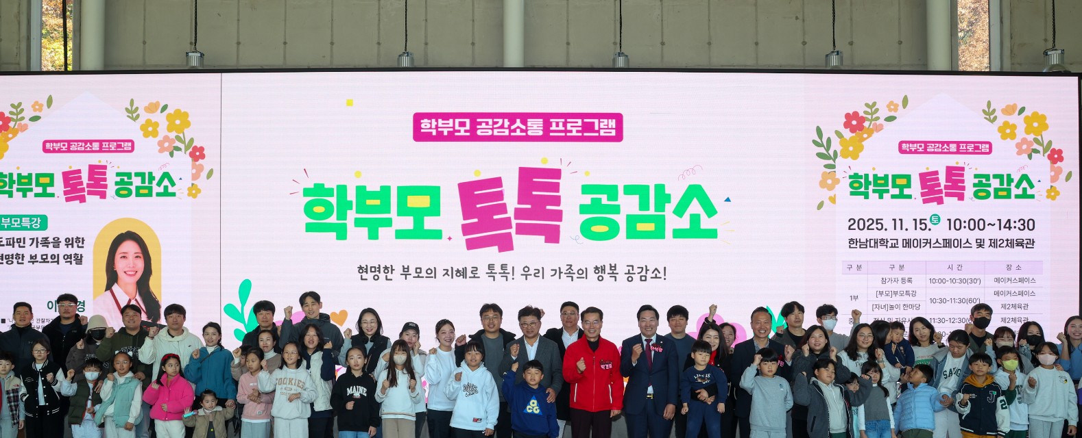 대전 대덕구, 학부모·자녀 함께하는 ‘학부모 톡톡 공감소’ 성료 20가족 70명 참여… 마을공동체 역량 강화·건강한 가정공동체 형성 지원 이은경 작가 특강·가족 화합 프로그램 등 학부모 교육 고민 해결·소통 강화 ‘호응’ 대전 대덕구(구청장 최충규)는 15일 한남대학교 메이커스페이스에서 ‘학부모 톡톡 공감소’를 열고 학부모와 자녀 70명이 함께 참여한 가운데 소통과 공감의 시간을 가졌다고 밝혔다. 학부모들이 자녀 교육에 대한 고민을 나누고, 마을·가정 공동체가 함께 성장할 수 있도록 지원하기 위해 마련된 이번 행사는 부모 특강과 가족 참여 프로그램 등 다양한 활동이 진행됐다. 특히 ‘나는 다정한 관찰자가 되기로 했다’, ‘도파민가족’의 저자 이은경 작가가 진행한 특강은 많은 공감을 얻었다. 이 작가는 강연과 대화를 통해 공감 중심의 대화법, 자녀와의 건강한 관계 형성 등에 대해 진솔하게 이야기했다 자녀들은 같은 시간 한남대학교 제2체육관에서 ‘놀이 한마당’ 프로그램을 즐겼으며, 이후 진행된 가족 화합 프로그램에서는 명랑운동회와 뉴스포츠 체험(콘홀 게임 등)을 통해 가족 모두가 한층 더 가까워지는 시간을 가졌다. 참여 학부모들은 “가족이 오랜만에 함께 뛰고 웃으며 진심으로 소통할 수 있는 시간이었다”고 소감을 전했다. 최충규 대덕구청장은 “이번 행사가 학부모와 자녀가 함께 성장하는 계기가 되었기를 바란다”며 “앞으로도 지역 내 가족이 함께 참여하고 공감할 수 있는 교육 프로그램을 지속적으로 운영해 나가겠다”고 밝혔다. [사진 설명(1) : 최충규 대덕구청장이 15일 한남대학교 메이커스페이스에서 열린‘학부모 톡톡 공감소’에 참석해 학부모들에게 인사를 전하고 있다.] [사진 설명(2) : 최충규 대덕구청장(사진 두 번째 줄 왼쪽 열 세 번째)이 ‘학부모 톡톡 공감소’에 참여한 지역 학부모, 자녀들과 파이팅을 외치며 기념 촬영을 하고 있다.] |