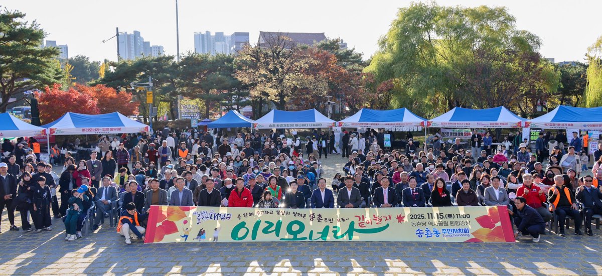 대전 대덕구 송촌동, 주민이 함께 만든 ‘이리오너라~ 같이놀자’ 축제 성황리 열려 동춘동공원서 1500여 명 모여… 주민 공연·체험부스·나눔장터 등 ‘다채’ 대전 대덕구(구청장 최충규) 송촌동은 15일 동춘당공원 원형광장에서 주민들이 함께 참여한 ‘이리오너라~ 같이놀자’ 마을축제를 성황리에 개최했다고 밝혔다. 송촌동주민자치회(회장 정용택) 주관으로 열린 이번 행사는 1500여 명의 주민이 참여해 공원을 가득 메우며 지역 공동체의 활력을 보여줬다. 축제는 여는 마당·어울림마당·나눔과 즐김마당으로 진행됐다. 여는 마당은 주민자치센터 수강생들의 난타·통기타·라인댄스 공연으로 시작됐고, 이어 주민 공연으로 색소폰 연주와 태권도 시범 등이 이어져 현장 분위기를 달궜다. 어울림마당에서는 개막식을 비롯해 노래교실, 줌바댄스, 특공무술 시연과 댄스보컬그룹 ‘군조크루’의 축하공연이 무대를 채웠다. 부대행사도 다양한 체험과 볼거리로 구성됐다. 송촌동 환경지킴이 사업의 아나바다 나눔장터, 탄소중립실천연대·자율방재단·주민자치회 자생단체가 운영한 체험·먹거리 부스가 가족 단위 방문객의 큰 호응을 얻었으며, 추첨 경품 이벤트로 축제의 재미를 더했다. 정용택 송촌동 주민자치회 회장은 “남녀노소가 함께 즐기는 마을 화합의 장으로 가을밤의 여유와 감성을 느낄 수 있었다”며 “살기 좋은 송촌동을 만들기 위해 주민 여러분의 지속적인 관심과 협조를 부탁드린다”고 말했다. 최충규 대덕구청장은 “주민이 직접 만들고 함께 참여하는 마을축제가 해마다 완성도가 높아지고 있다. 그만큼 주민들 간 화합이 깊어졌다는 것”이라며 “많은 주민이 축제장을 찾아 가을의 정취 속에서 소통과 화합을 즐기는 시간이 되길 바란다”고 전했다. [사진 설명 : 최충규 대덕구청장(사진 첫 번째 줄 왼쪽 아홉 번째)과 이장우 대전시장(사진 첫 번째 줄 왼쪽 여덟 번째) 및 관계자, 송촌동 주민들이 15일 동춘당공원 원형광장에서 주민들이 함께 참여한 ‘이리오너라~ 같이놀자’ 마을축제에서 기념 촬영을 하고 있다.] |