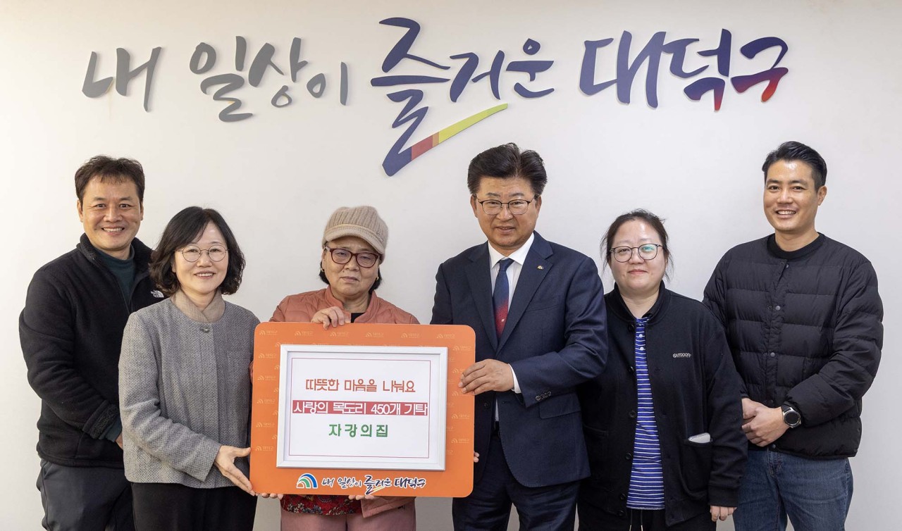 노숙인 재활시설 자강의집, 대전 대덕구에 ‘사랑의 목도리’ 450개 기부 생활인들이 직접 뜬 정성… 2016년부터 따뜻한 나눔 이어와 대전 대덕구(구청장 최충규)는 26일 노숙인 재활시설 자강의집(원장 안을순)으로부터 겨울철 취약계층과 어려운 이웃들을 위한 ‘사랑의 목도리’ 450개를 기부받았다. 자강의집의 ‘사랑의 목도리’은 2016년부터 이어진 생활인 참여형 나눔 프로그램이다. 생활인들은 틈틈이 시간을 내 뜨개질을 하며 목도리를 완성했고, 올해도 총 450개의 목도리가 마련돼 지역 취약계층에게 온기를 전할 예정이다. 프로그램에 참여한 한 생활인은 “시설에서 받은 도움을 이웃에게 돌려줄 수 있어 기쁘고 보람된다”고 말했다. 안을순 자강의집 원장은 “생활인들이 지역사회 구성원으로 참여할 수 있도록 다양한 프로그램을 지속 운영해 우리 이웃으로 돌아갈 수 있도록 최선을 다하겠다”고 말했다. 최충규 대덕구청장은 “생활인들의 따뜻한 마음이 담긴 목도리를 통해 서로 돕고 배려하는 지역사회의 소중한 가치를 다시 한번 느낄 수 있었다”며 “서로 돕는 따뜻한 공동체 문화를 확산하겠다”고 전했다. [사진 설명 : (사진 왼쪽부터) 유기봉 자강의집 자원봉사 담당, 안을순 자강의집 원장, 이숙희 자강의집 생활인 대표, 최충규 대덕구청장, 홍문주 자강의집 프로그램 담당, 류호선 자강의집 사무국장이 26일 겨울철 취약계층과 어려운 이웃들을 위한 ‘사랑의 목도리’ 기탁식을 마친 후 기념 촬영을 하고 있다.] |