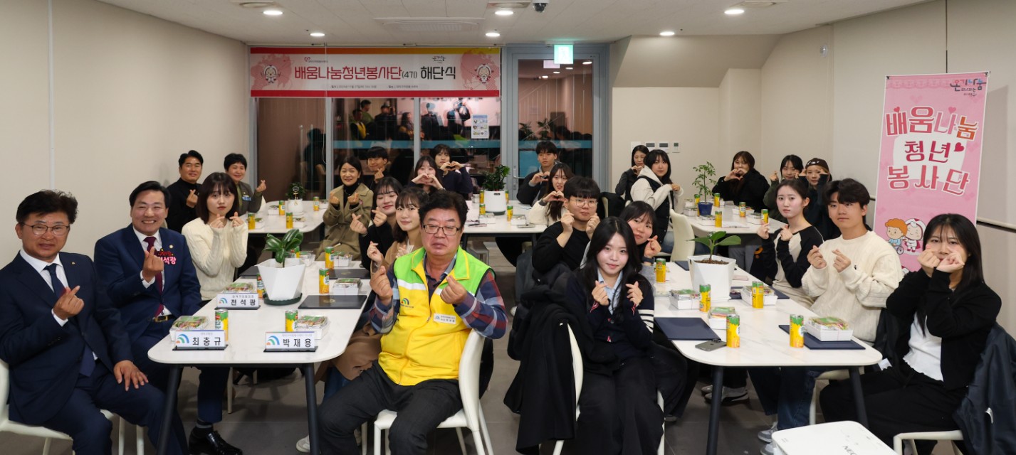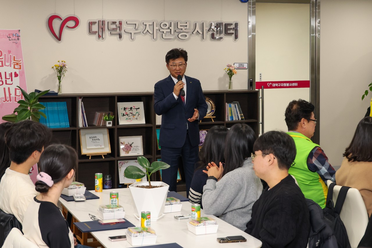 (사)대덕구자원봉사센터, 2025 배움나눔청년봉사단 4기 해단식 개최 50명 청년 봉사자 1년 활동 마무리… 플로깅․기획봉사․연탄봉사 등 다양한 활동 전개 구청장·이사장 표창 수여… “청년의 선한 영향력, 지역사회 긍정적 변화 이끌어” 대전 대덕구(구청장 최충규)는 (사)대덕구자원봉사센터(이사장 박재용)가 ‘2025 대덕구 배움나눔청년봉사단 4기 해단식’을 개최했다고 밝혔다. 이번 해단식은 ▲구청장 및 자원봉사센터 이사장 표창 수여 ▲내빈 인사 및 기념촬영 ▲청년봉사단 활동 성과 공유 ▲기획 자원봉사 활동 발표 ▲수료증 전달 순으로 진행됐다. 올해 배움나눔청년봉사단에는 총 50명의 청년들이 참여해 플로깅(plogging), 오란다 만들기 나눔, 기획봉사 프로그램(무비메이트·마음정거장·두드림), 온기나눔 연탄봉사 등 지역사회 곳곳에서 다양한 자원봉사 활동을 펼쳤다. 특히 봉사활동에 열정적으로 참여한 단원에게는 표창이 수여됐다. 구청장 표창은 ▲박서진 ▲박새별 ▲송채은 단원이, 이사장 표창은 ▲김유빈 ▲김민지 ▲도윤구 ▲신혜원 단원이 각각 수상의 영예를 안았다. 박재용 (사)대덕구자원봉사센터 이사장은 “청년들의 열정과 선한 영향력이 지역사회의 긍정적 변화를 이끌고 있다”며 “앞으로도 배움과 나눔의 가치를 실천하는 청년들이 더 성장할 수 있도록 아낌없이 지원하겠다”고 말했다. 최충규 대덕구청장은 “기꺼이 시간을 내어 이웃을 돕는 청년 여러분은 지역의 자랑이자 미래의 큰 힘”이라며 “여러분의 활동이 지역사회에 따뜻한 울림을 전해주었다”고 말했다. 한편, 배움나눔청년봉사단은 올해로 4기 활동을 마무리했으며, 2026년에는 5기 단원을 모집해 더욱 다양한 청년 참여형 자원봉사 프로그램을 운영할 계획이다. [사진 설명 (1) : 최충규 대덕구청장이 27일 ‘2025 대덕구 배움나눔청년봉사단 4기 해단식’에서 인사를 전하고 있다.] [사진 설명 (2) : 최충규 대덕구청장(사진 첫 번째 줄 왼쪽 첫 번째), 박재용 (사)대덕구자원봉사센터 이사장(사진 첫 번째 줄 왼쪽 두 번째)과 배움나눔청년봉사단원들이 해단식 진행 후 기념사진을 촬영하고 있다.] |