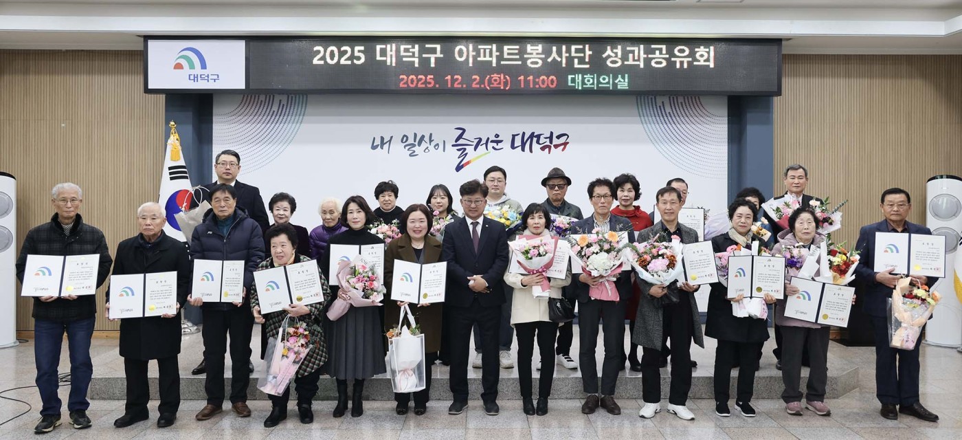 대전 대덕구, 20개 아파트봉사단과 한해 성과 공유 자원봉사자 표창·성과 발표… 지역 공동체성 강화 기반 다져 대전 대덕구(구청장 최충규)는 (사)대덕구자원봉사센터(이사장 박재용)가 2일 구청 대회의실에서 20개 아파트봉사단과 함께 ‘2025년 대덕구 아파트봉사단 성과공유회’를 개최했다고 밝혔다. 이날 성과공유회는 △우수자원봉사자 표창 △내빈 인사 △기념 촬영 △아파트봉사단 활동 성과 공유 △오찬 순으로 진행됐다. 행사에는 아파트봉사단 임원 및 수상자 등 70여 명이 참석해 올해 활동을 돌아보고 서로의 노고를 격려했다. 박재용 (사)대덕구자원봉사센터 이사장은 “올해도 아파트봉사단의 꾸준한 활동 덕분에 지역 공동체를 보다 따뜻하게 만들었다”며 “앞으로도 봉사자들이 자부심을 느끼며 활동할 수 있도록 지원을 아끼지 않겠다”고 말했다. 최충규 구청장은 “아파트봉사단은 주민 스스로 지역 문제를 해결하는 가장 모범적인 모델”이라며 “주민 주도의 자원봉사 활동이 더욱 확산될 수 있도록 다양한 협력 사업을 지속 추진하겠다”고 밝혔다. 한편, (사)대덕구자원봉사센터는 22개 아파트봉사단과 함께 자원봉사를 통한 공동체성 회복을 위해 ‘사부작사부작’ 운동을 중심으로 활발한 활동을 이어오고 있다. [사진 설명(1) : 최충규 대덕구청장(사진 첫 번째 줄 가운데)과 우수자원봉사자들이 표창장을 전달받은 후 기념 촬영을 하고 있다.] [사진 설명(2) : 최충규 대덕구청장(사진 첫 번째 줄 왼쪽 두 번째)과 박재용 (사)대덕구자원봉사센터 이사장(사진 첫 번째 줄 왼쪽 세 번째), 아파트봉사단원 임원 및 수상자들이 2일 구청 대회의실에서 열린 ‘2025년 대덕구 아파트봉사단 성과공유회’에서 기념 촬영을 하고 있다.] |