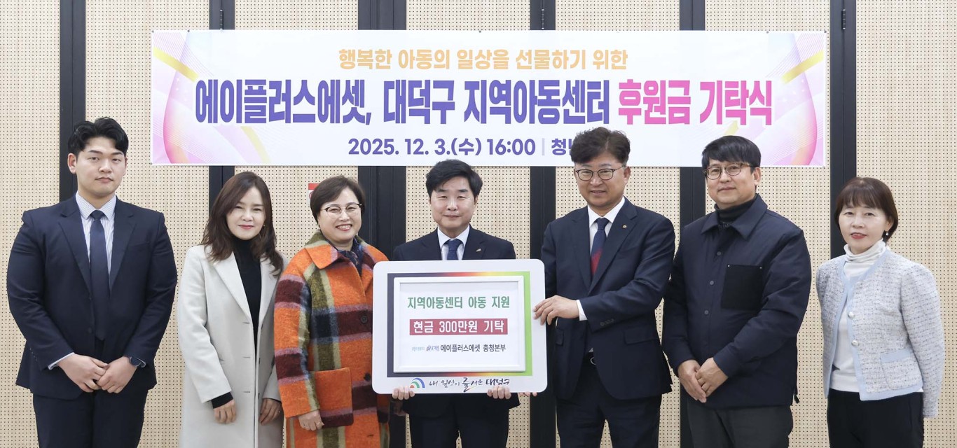 에이플러스에셋 충청본부, 대덕구 지역아동센터 지원 후원금 300만원 기탁 지역아동센터 연합발표회 지원… 아동 재능발표·응원 분위기 조성에 힘 보태 대전 대덕구(구청장 최충규)는 3일 에이플러스에셋 충청본부(본부장 서동욱)로부터 대덕구 지역아동센터 아동 지원을 위한 후원금 300만원을 기탁받았다. 이번 후원금은 ‘2025 대덕구 지역아동센터 연합발표회’ 운영비로 사용돼, 아동들이 1년 동안 준비한 무대를 마음껏 펼칠 수 있는 여건 조성에 기여했다. 서동욱 에이플러스에셋 충청본부장은 “아동들이 자신의 재능을 마음껏 펼치며 행복을 느낄 수 있는 의미 있는 자리에 함께할 수 있어 매우 뜻깊다”며 “앞으로도 지역사회와 상생하며 아동과 이웃에게 힘이 되는 나눔을 꾸준히 이어가겠다”고 말했다. 김현수 대덕구지역아동센터연합회 회장은 “아이들의 꿈을 위해 의미 있는 나눔을 실천해 주신 에이플러스에셋에 깊은 감사의 마음을 전한다”며 “이번 지원은 아이들에게 따뜻한 격려가 됐다”고 밝혔다. 최충규 대덕구청장은 “지역 아동을 위한 귀한 나눔에 감사드리며, 민·관이 함께 힘을 모아 아이들이 행복한 환경에서 성장할 수 있도록 최선을 다하겠다”고 말했다. 한편, 에이플러스에셋 충청본부는 임직원의 자발적인 성금 참여로 지역 내 취약계층과 아동을 꾸준히 지원하며, 지역사회와 더불어 살아가는 나눔 문화를 이어오고 있다. [사진 설명 : (사진 왼쪽부터) 김솔 에이플러스에셋 프로, 이효영 대덕구지역아동센터연합회 총무, 김현수 대덕구지역아동센터연합회 회장, 서동욱 에이플러스에셋 충청본부장, 최충규 대덕구청장, 오창규 건설과 주무관, 박진영 가족친화과장이 3일 대덕구 청년벙커에서 대덕구 지역아동센터 아동 지원을 위한 후원금 기탁식을 마친 후 기념 촬영을 하고 있다.] |