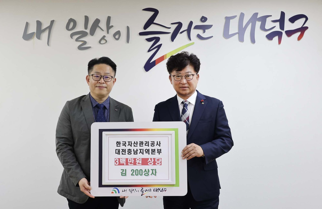 한국자산관리공사 대전충남지역본부, 대전 대덕구에 김 200상자 기탁 300만원 상당 기탁… 지역 129개 경로당에 전달 대전 대덕구(구청장 최충규)는 한국자산관리공사 대전충남지역본부(본부장 이강철)로부터 300만원 상당의 김 200상자를 기탁받았다고 밝혔다. 기탁받은 물품은 대전사회복지공동모금회를 통해 지역 129개 경로당에 전달될 예정이다. 이강철 한국자산관리공사 대전충남지역본부장은 “경제적으로 어려운 시기에 지역사회와 사회적 책임을 함께 나눌 수 있어 기쁘다”며 “앞으로도 지속 가능한 사회공헌 활동을 이어가겠다”고 전했다. 최충규 대덕구청장은 “지역 어르신들을 위한 한국자산관리공사 대전충남지역본부의 관심과 배려에 진심으로 감사드린다”며 “기탁된 물품은 경로당 어르신들의 따뜻한 겨울나기를 위해 잘 전달하겠다”고 말했다. 한편, 한국자산관리공사 대전충남지역본부는 온누리상품권과 건강식품 기탁, 지역농산물 기부와 재난 후원 등 다양한 사회공헌 활동을 통해 지역사회와의 상생을 실천하고 있다. [사진 설명 : (사진 왼쪽부터) 이강철 한국자산관리공사 대전충남지역본부장과 최충규 대덕구청장이 17일 구청 구민의사랑방에서 이웃사랑 실천을 위한 후원품 기탁식을 마친 후 기념 촬영을 하고 있다.] |