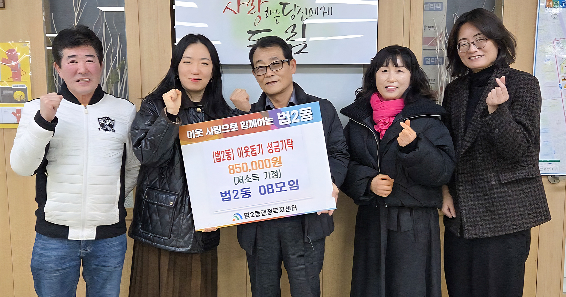 대전 대덕구 법2동 OB모임, 취약계층 돕기 성금 기탁 법2동 전·현직 자생단체장 모임… 지역 공동체 책임 실천 이어져 대전 대덕구 법2동(동장 최은호)은 법2동 전·현직 자생단체장으로 구성된 ‘법2동 OB(Old Boy)모임’이 지역 내 취약계층을 돕기 위한 이웃돕기 성금을 기탁했다고 밝혔다. 이번에 기탁된 성금은 법2동 행정복지센터를 통해 생활이 어려운 가구를 우선 선정해 지원되며, 대상자의 상황에 맞는 복지사업과 연계해 활용될 계획이다. 법2동 OB모임은 지역 현안을 함께 논의하고 봉사활동을 지속해 온 단체로, 이번 나눔 역시 회원들의 자발적인 뜻이 모여 마련됐다. 온갑섭 법2동 OB모임 회장은 “지역에 필요한 곳을 살피는 것이 우리의 역할”이라며 “작은 정성이지만 이웃들에게 힘이 되길 바란다”고 말했다. 최은호 법2동장은 “지역 발전을 위해 꾸준히 관심과 정성을 나눠 주시는 OB모임 회원분들께 감사드린다”며 “기탁된 성금을 투명하고 공정하게 활용해 주민들이 체감할 수 있는 복지 지원으로 이어지도록 하겠다”고 밝혔다. [사진 설명 : 대전 대덕구 법2동 전·현직 자생단체장으로 구성된 ‘법2동 OB(Old Boy)모임’ 회원들과 대덕구 법2동 직원들이 17일 이웃돕기 성금을 기탁한 후 기념 촬영을 하고 있다.] |