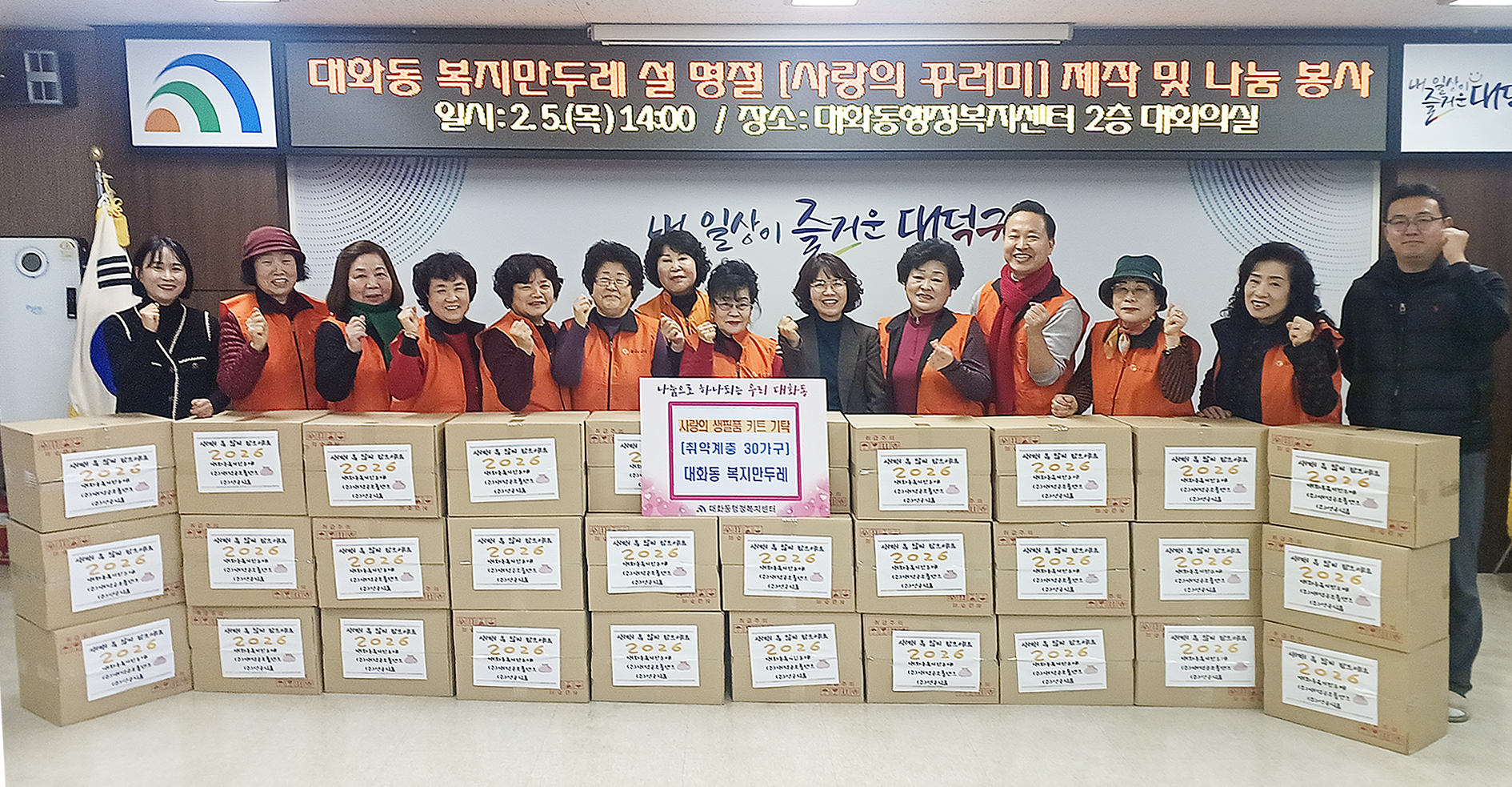 대전 대덕구 대화동 복지만두레, 사랑의 꾸러미 나눔 봉사 실시 설 앞두고 생필품 등 꾸러미 만들어 지역 내 취약계층 30가구에 전달 대전 대덕구 대화동(동장 장선영)은 대화동 복지만두레(회장 조영희)가 5일 설날을 맞아 취약계층을 위한 ‘사랑의 꾸러미 나눔 봉사’를 진행했다고 밝혔다. 이번 나눔은 복지만두레 회원들이 생활에 꼭 필요한 식료품과 생필품을 정성껏 준비해 홀몸 어르신과 장애인 가정 등 30가구에 직접 전달하며, 건강 상태와 안부를 살피고 정서적 교류를 나누기 위해 마련됐다. 조영희 대화동 복지만두레 회장은 “설날을 맞아 작은 정성이지만 이웃들에게 보탬이 되길 바라는 마음으로 준비했다”며 “앞으로도 복지 사각지대 해소를 위해 지속적으로 노력하겠다”고 말했다. 장선영 대화동장은 “꾸준한 나눔 실천으로 지역 복지의 든든한 버팀목이 돼 주신 복지만두레 회원들께 깊은 감사를 드린다”며 “앞으로도 더 따뜻한 마을 공동체를 만들기 위해 촘촘한 복지 안전망 구축에 최선을 다하겠다”고 전했다. [사진 설명 : 장선영 대화동장과 대화동 복지만두레 회원들이 5일 설 명절을 앞두고 지역 취약계층을 위한 사랑의 꾸러미를 만든 후 기념촬영을 하고 있다.] |