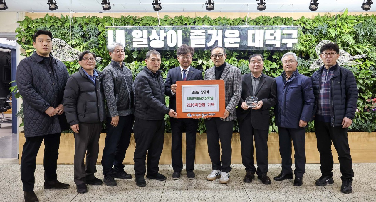 오정동 상인회, 대전 대덕구에 장학금 2600만원 기탁 상인회 소속 9개 업체 참여… 대덕인재육성사업 저소득 성적 우수 학생에 지원 대전 대덕구는 6일 오정동 상인회(회장 강대웅)로부터 지역 인재 육성을 위한 이웃돕기 성금 2600만원을 기탁받았다. 이번 성금은 △유광상회(대표 박찬홍)△미트갤러리(대표 윤영섭) △금천축산(대표 장성도) △천일한결포크(대표 송진숙), △서해냉동식품(대표 강대웅) △오정축산(대표 배종렬) △보광상사(대표 박은규) △소망글로벌축산(대표 한부환) △무궁화축산(대표 정재욱) 등 오정동 상인회 소속 9개 업체가 십시일반 뜻을 모아 마련했다. 기탁된 성금은 대전사회복지공동모금회를 통해 대덕인재육성사업 장학생으로 선발된 저소득 성적 우수 학생들에게 장학금으로 지급될 예정이다. 기탁식에 참석한 오정동 상인회 대표들은 “경제적 어려움 속에서도 학업에 힘쓰는 지역 학생들에게 도움이 되고자 기부를 결정했다”며 “앞으로도 지역사회와 함께하는 나눔을 지속적으로 실천하겠다”고 밝혔다. 대덕구 관계자는 “어려운 경제 상황 속에서도 지역 인재 육성을 위해 따뜻한 나눔에 동참해 주신 오정동 상인회 대표들께 감사드린다”며 “기탁해 주신 성금은 저소득 성적 우수 학생들의 장학금으로 소중히 전달하겠다”고 말했다. [사진 설명 : (사진 왼쪽부터) 윤덕영 미트갤러리 대리, 정재욱 무궁화축산 대표, 장성도 금천축산 대표, 배종렬 오정축산 대표, 최충규 대덕구청장, 강대웅 서해냉동식품 대표, 박찬홍 유광상회 대표, 송진숙 천일한결포크 대표, 한부환 소망글로벌축산 대표가 6일 지역 인재 육성을 위한 이웃돕기 성금 기탁식 후 기념촬영을 하고 있다.] |