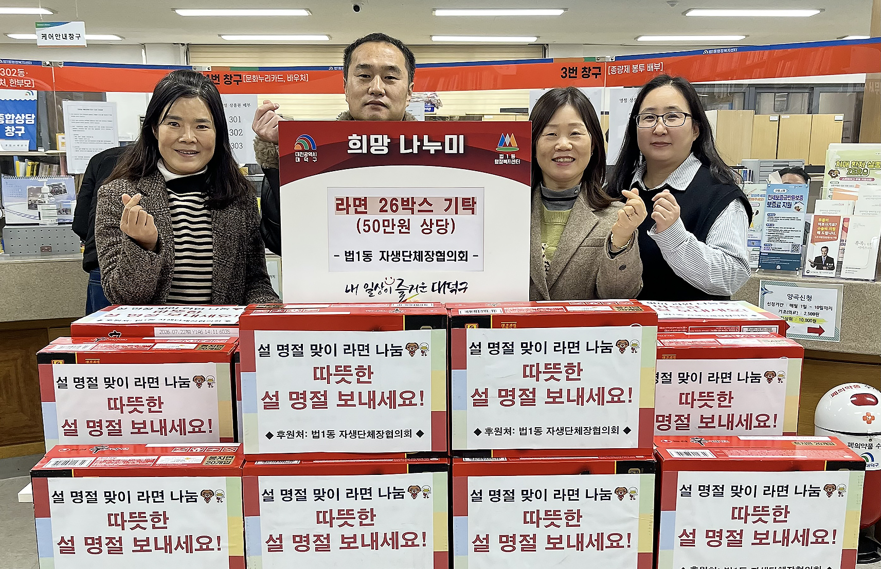 대전 대덕구 법1동, 설 앞두고 이웃 사랑 실천 잇따라 자생단체장협의회 라면, 주민자치회·자율방범대 떡국떡 기탁 통장협의회, 쾌적한 환경 위해 마을 대청소 전개… 명절 맞이 온정 확산 대전 대덕구 법1동(동장 김영희)은 설 명절을 앞두고 지역 단체들이 취약계층 지원과 마을 환경정비 활동을 잇따라 추진했다고 밝혔다. 먼저 법1동 자생단체장협의회(회장 오전환)는 지역 어려운 이웃을 돕기 위해 50만 원 상당의 라면 26박스를 기탁했다. 이어 법1동 주민자치회(회장 허영욱)와 자율방범대(대장 김성곤)는 설 명절을 맞아 떡국떡 100박스(박스당 2kg)를 공동 기탁했다. 기탁 물품들은 법1동 행정복지센터를 통해 지원이 필요한 취약계층 가구에 지원될 계획이다. 또한 법1동 통장협의회(회장 서경숙)는 다가오는 설 명절을 맞아 고향을 찾는 귀성객과 주민들에게 쾌적한 환경을 제공하기 위해 11일 ‘설맞이 마을 대청소’를 대대적으로 실시했다. 김영희 법1동장은 “각 단체가 나눔과 환경정비를 나눠 추진해 지역사회에 명절 온기가 더해지고 있다”며 법1동 관계자는 “각 단체가 나눔과 환경정비를 나눠 추진해 지역사회에 명절 온기가 더해지고 있다”며 “기탁 물품이 필요한 곳에 전달될 수 있도록 세심히 챙기겠다”고 말했다. [사진 설명(1) : 오전환 법1동 자생단체장협의회장(사진 왼쪽 두 번째)과 김영희 법1동장(사진 왼쪽 세 번째) 및 관계자들이 지역 어려운 이웃을 돕기 위한 라면 기탁식을 마친 후 기념 촬영 하고 있다.] [사진 설명(2) : (사진 왼쪽부터) 허영욱 법1동 주민자치회장과 김성곤 법1동 자율방범대장, 김영희 법1동장이 설 명절을 맞아 떡국떡 기탁식을 마친 후 기념 촬영을 하고 있다.] [사진 설명(3) : 김영희 법1동장과 법1동 통장협의회 회원들이 11일 설 명절을 맞아 고향을 찾는 귀성객과 주민들에게 쾌적한 환경을 제공하기 위해 설 맞이 대청소를 마친 후 기념 촬영을 하고 있다.] |