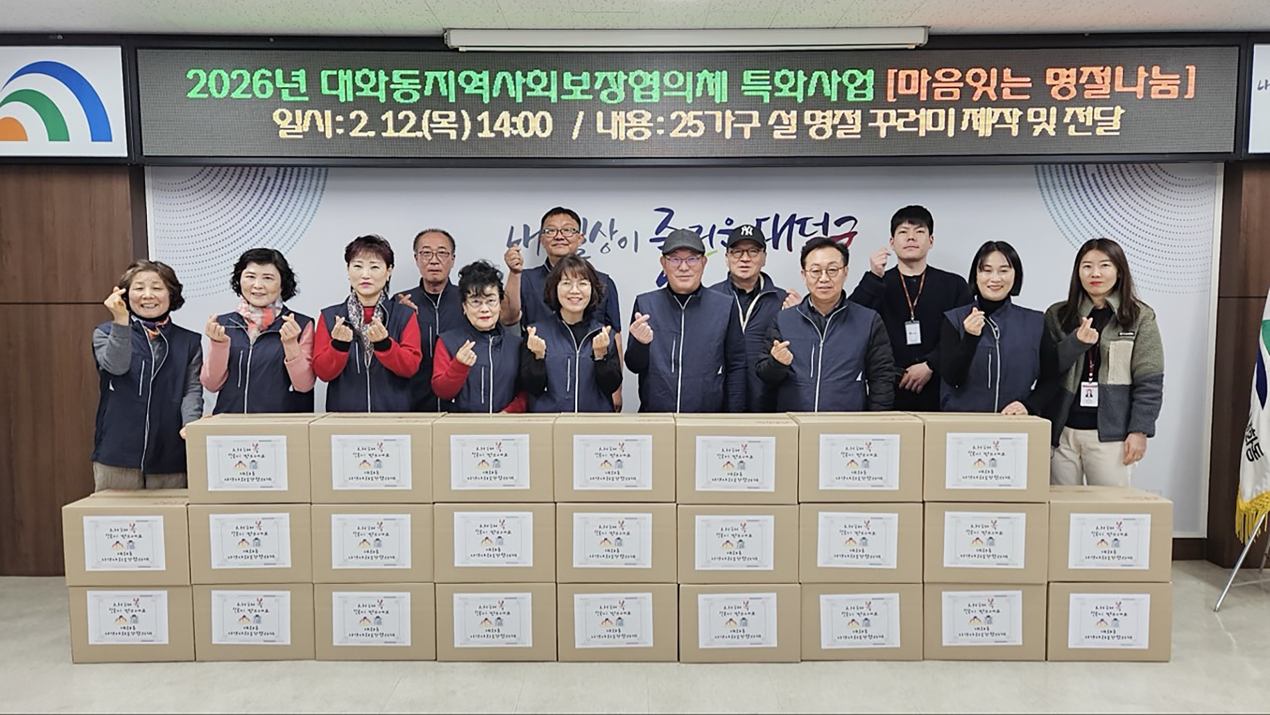 대전 대덕구 대화동 지역사회보장협의체, 이웃 사랑 설 꾸러미 지원 취약계층 홀몸 어르신 25명에 5만원 상당 명절 식품 전달 대전 대덕구 대화동(동장 장선영)은 12일 대화동 지역사회보장협의체(위원장 이기태)가 설 명절을 맞아 ‘마음 잇는 명절 나눔’ 식품 꾸러미 지원사업을 추진했다고 밝혔다. 이번 사업은 설 연휴 기간 식사 준비에 어려움을 겪는 1인 가구 어르신의 생활 부담을 덜고 정서적 안정을 돕기 위해 추진됐다. 협의체는 65세 이상 홀몸 어르신 등 취약계층 25명을 대상으로 영양밥, 갈비탕, 과일, 뉴케어 등으로 구성된 5만원 상당의 명절 꾸러미를 마련해 전달했다. 또한 안부를 확인하는 등 정서적 지지 활동을 함께 펼쳤다. 이기태 대화동 지역사회보장협의체 위원장은 “명절마다 홀로 지내시는 어르신들께 작은 정성과 따뜻한 마음을 전하고자 위원님들과 함께 준비했다”며 “앞으로도 이웃과 이웃을 잇는 돌봄 활동을 이어가겠다”고 말했다. 장선영 대화동장은 “설 명절 식품 꾸러미 지원사업이 지속 가능한 명절 나눔 사업으로 자리 잡도록 적극 지원하겠다”며 “앞으로도 주민이 체감할 수 있는 맞춤형 복지를 통해 따뜻한 대화동을 만들어 가겠다”고 말했다. [사진 설명 : 장선영 대화동장(사진 첫 번째 줄 왼쪽 다섯 번째)과 이기태 대화동 지역사회보장협의체 위원장(사진 첫 번째 줄 왼쪽 여섯 번째), 대화동 지역사회보장협의체 위원 및 대화동 직원들이 12일 설 연휴 기간 식사 준비에 어려움을 겪는 1인 가구 어르신을 위한 ‘마음 잇는 명절 나눔’ 식품 꾸러미를 전달하기에 앞서 기념 촬영을 하고 있다.] |