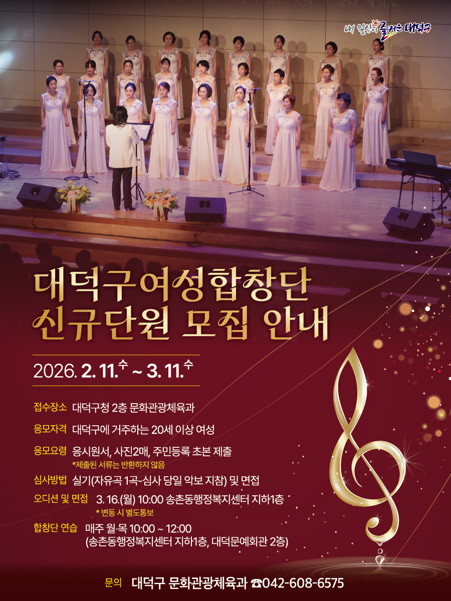 대전 대덕구, 여성합창단 신규 단원 모집… 3월 11일까지 접수 15명 이내 선발… 대덕구 거주 20세 이상 여성 지원 가능 정기연주회·힐링음악회 등 다양한 문화예술 활동 참여 대전 대덕구가 지역 문화예술 활성화를 위해 여성합창단 신규 단원을 모집한다. 구는 3월 11일까지 ‘대덕구여성합창단’ 일반단원 15명 이내를 선발한다고 밝혔다. 지원 자격은 대덕구에 거주하는 20세 이상 여성으로, 성악 경험과 소질을 갖춘 주민이면 지원할 수 있다. 대덕구 여성합창단은 매주 월·목요일 오전 10시부터 12시까지 정기연습을 진행하고 있으며, 정기연주회와 힐링음악회, 구 행사 찬조공연 등 다양한 문화예술 활동에 참여하고 있다. 지원자는 응시원서와 관련 서류를 대덕구청 문화관광체육과로 업무시간(오전 9시~오후 6시) 내 방문 제출하면 된다. 오디션 및 면접은 3월 16일 오전 10시 송촌동 행정복지센터 지하 1층에서 진행되며, 오디션 당일 악보를 지참해 자유곡 1곡을 부르는 방식으로 실시된다. 대덕구 관계자는 “대덕구 여성합창단은 지역을 대표하는 문화예술단체로 각종 공연과 행사에서 구민과 함께 호흡해 왔다”며 “음악을 사랑하는 주민들의 많은 관심과 참여를 바란다”고 말했다. 자세한 사항은 대덕구 누리집 공고문을 확인하거나 대덕구청 문화관광체육과(☏042-608-6575)로 문의하면 된다. [사진 설명 : 대덕구여성합창단 신규단원 모집 안내 포스터] |