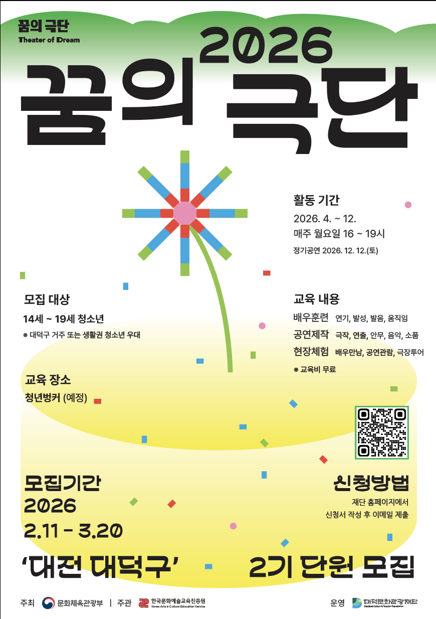 청소년이 무대의 주인공 된다… 대덕문화관광재단 ‘꿈의 극단’ 2기 모집 내달 20일까지 대덕구 거주·재학 청소년 대상 연극 기반 문화예술교육 운영… 정기공연 통해 창작 경험 확대 대전 대덕구는 대덕문화관광재단이 대덕구 거주 청소년을 대상으로 ‘2026 꿈의 극단 - 대전 대덕구’ 2기 청소년 단원을 모집한다고 밝혔다. ‘꿈의 극단 - 대전 대덕구’는 문화체육관광부가 주최하고 한국문화예술교육진흥원이 주관하는 사업으로 대덕문화관광재단이 지역 운영을 맡아 청소년을 대상으로 연극 중심 문화예술교육을 제공한다. 선발된 단원들은 3월부터 12월까지 정기교육에 참여한다. 연극 분야 전문가의 지도 아래 연기·발성·움직임·극 창작 교육을 받으며 무대 예술 전반을 체계적으로 경험하게 된다. 또한 참여자들의 경험과 이야기를 바탕으로 작품을 직접 기획·제작하고, 조명과 음향 시설이 완비된 무대에서 정기공연을 선보일 예정이다. 지원 대상은 대덕구 거주 또는 대덕구 소재 학교에 재학 중인 중·고교 연령 청소년이다. 학교 밖 청소년도 지원 가능하며, 사회통합범주계층은 우선 선발한다. 대덕문화관광재단 이사장은 “꿈의 극단을 통해 청소년들이 예술의 주체로 성장하고 무대 위에서 자신만의 이야기를 표현하는 소중한 경험을 하길 바란다”며 “지역 기반 문화예술교육이 안정적으로 자리 잡도록 적극 지원하겠다”고 밝혔다. 모집 및 세부 내용은 대덕문화관광재단 누리집에서 확인할 수 있으며, 관련 문의는 대덕문화관광재단(☏042-936-2400)으로 하면 된다. [사진 설명 : 대덕문화관광재단 ‘2026 꿈의 극단 – 대덕구’ 2기 단원 모집 홍보 포스터] |