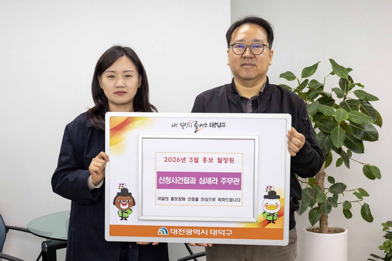 1. 대전 대덕구 2026년 3월 홍보장원 ‘신청사 건립 순항’ 선정.hwp(161.5KB) 1. 대전 대덕구 2026년 3월 홍보장원 ‘신청사 건립 순항’ 선정.jpg(166.2KB) |