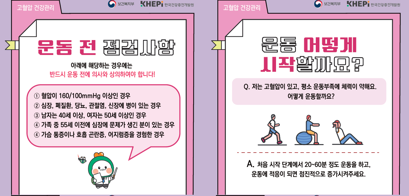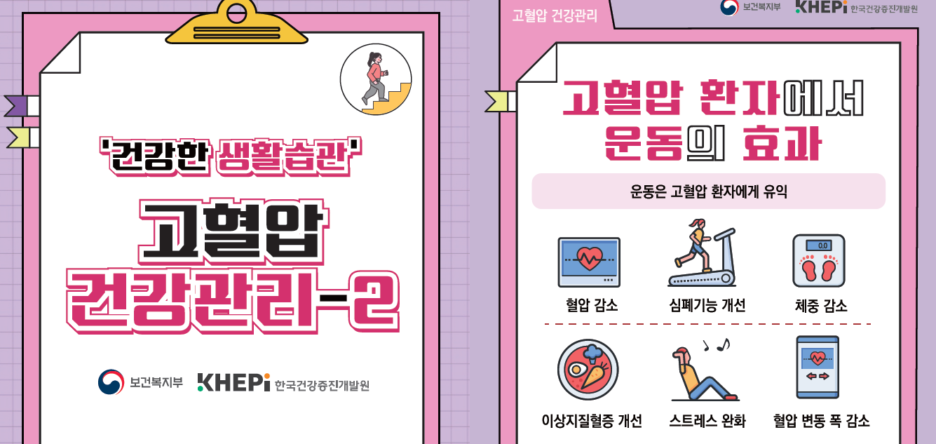 안녕하세요. 대덕구 남부건강생활지원센터 신체활동 담당자 입니다. 즐거운 추석 연휴 보내셨나요? 10월의 운동정보는 '고혈압 건강관리' 입니다. 규칙적인신체활동으로 건강하게 고혈압을 관리 할 수 있도록 첨부드린 카드 뉴스를 참고해 주시길 바랍니다. 감사합니다. (출처) 한국건강증진개발원 |