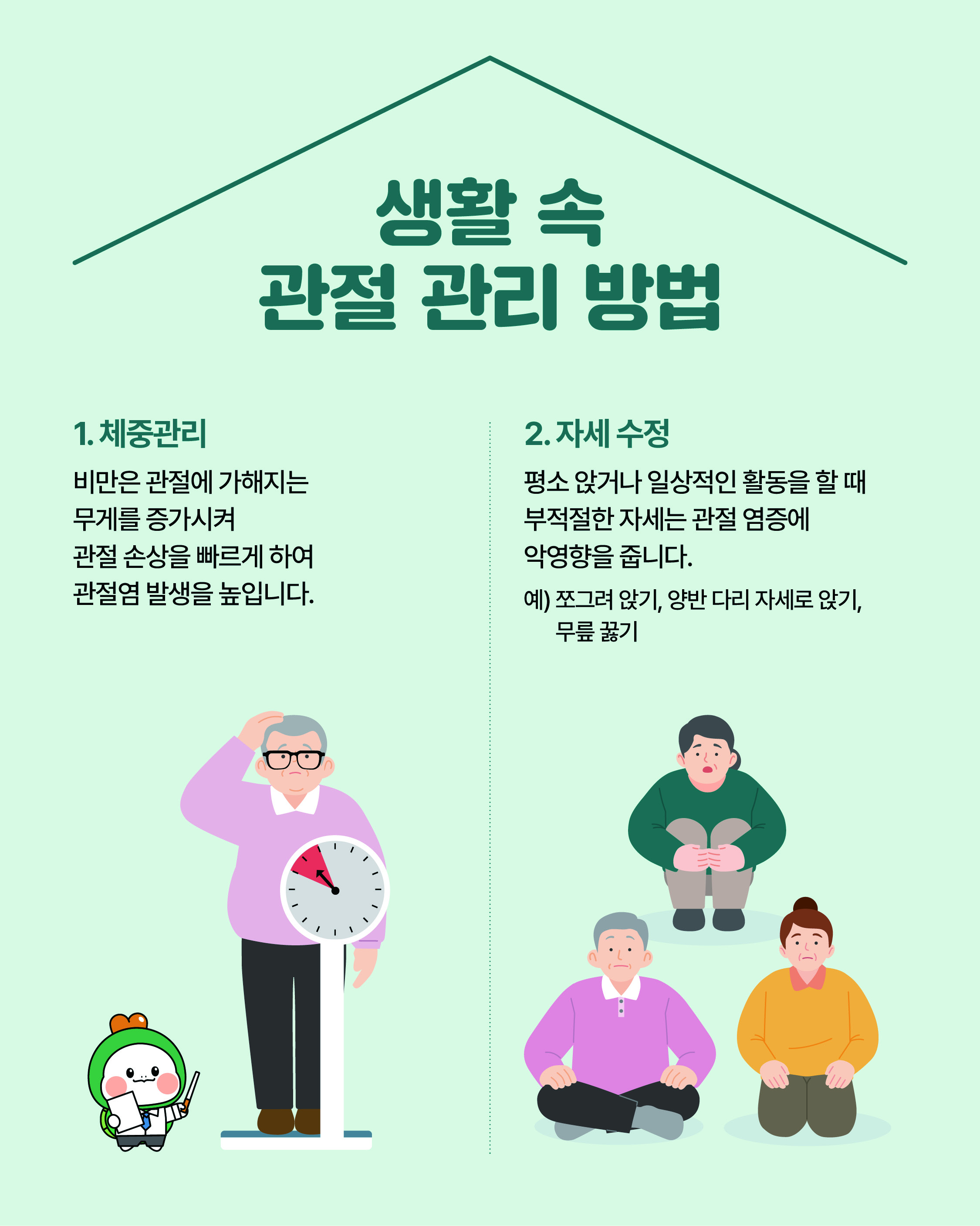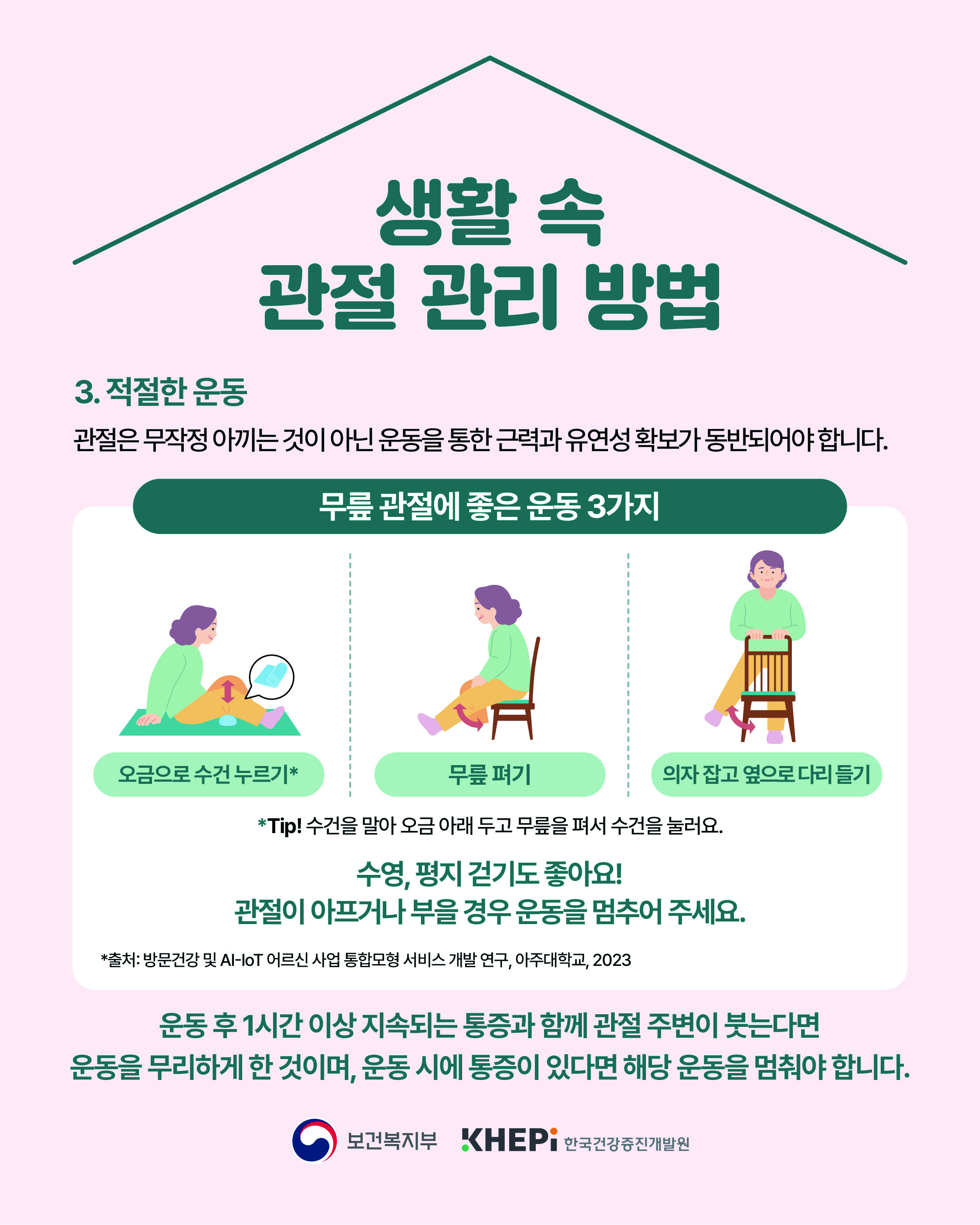 안녕하세요 대덕구 남부건강생활지원센터입니다. 2026년 1월의 운동정보는 '관절 사전예방으로 건강하게 관리 할 수 있습니다.' 입니다. 카드뉴스 맨 마지막 페이지의 운동 방법을 참고하시어 본인의 체력 수준에 맞춰 운동을 진행해주시면 좋을 것 같습니다. 추운 겨울철 실내에서 안전하게 근력운동을 실천하셔서 관절을 튼튼하게 관리해주시길 바랍니다. 감사합니다. (출처) 한국건강증진개발원 |
