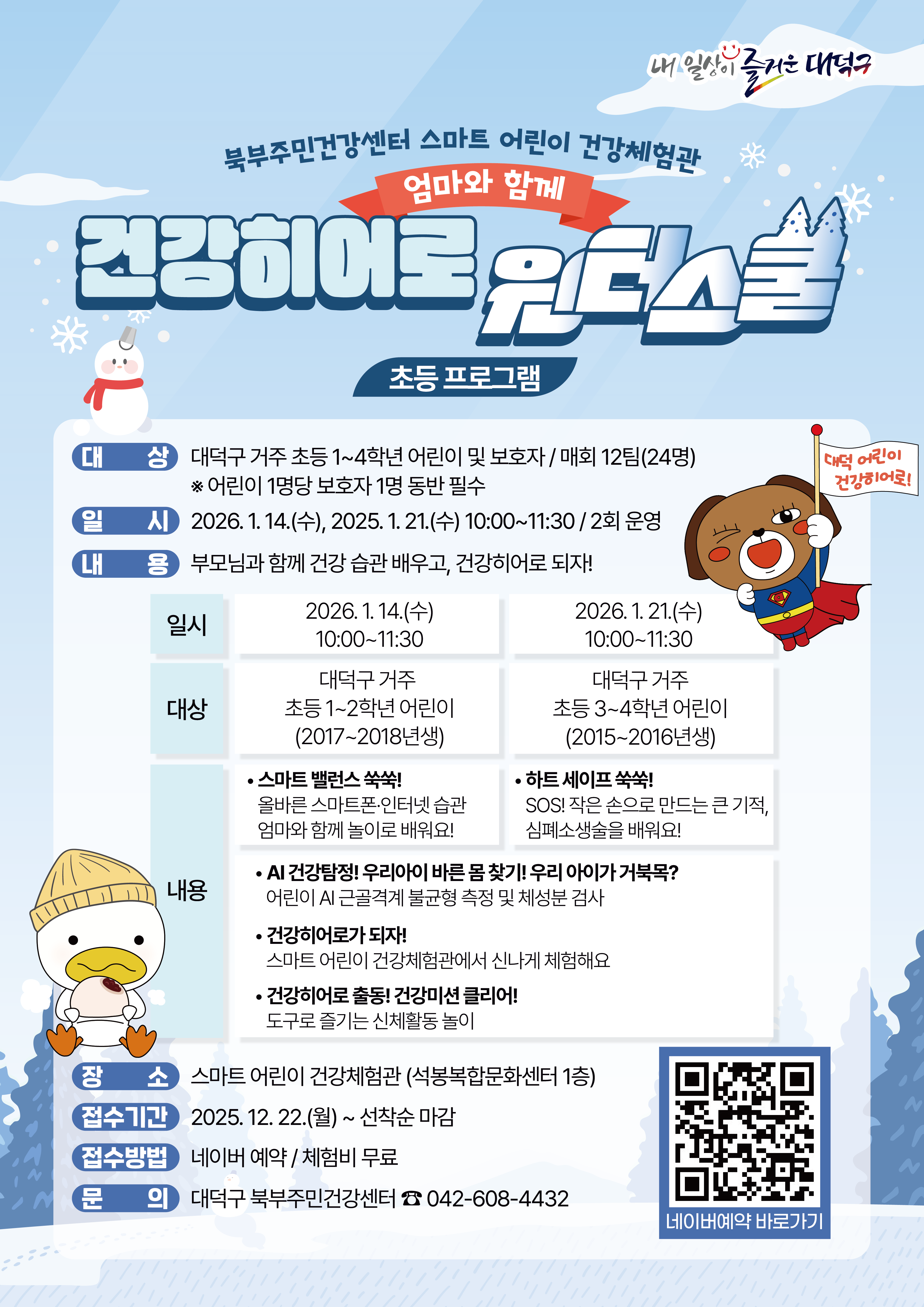 대덕구 북부주민건강센터에서는 겨울방학을 맞아 부모님과 함께 건강한 생활 습관을 배울 수 있는 어린이 건강프로그램을 운영합니다. (대 상) 대덕구 거주 5~7세 및 초등 1~4학년 어린이, 보호자(부모님 등)/매회 12팀(24명) (일 시) 2026. 1. 14.(수) ~ 2026. 2. 4.(수) / 매주 수요일 총 4회 (내 용) 부모와 자녀가 함께하는 건강체험 프로그램 (장 소) 대덕구 북부주민건강센터 스마트 어린이 건강체험관(대덕구 대덕대로 1579, 석봉복합문화센터 1층) (접수기간) 2025. 12. 22.(월) ~ 선착순 마감 (접수방법) 네이버 예약 / 체험비 무료 ★ 자세한 내용 및 예약링크는 안내문을 참고 바랍니다. 감사합니다. (문 의) 대덕구 북부주민건강센터(☎042-608-4432) |