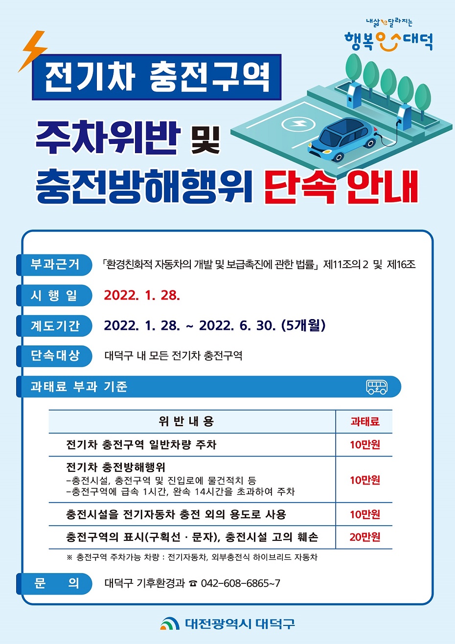 <전기자동차 충전구역 내 충전방해 행위 단속> 「친환경자동차법」 개정에 따라 전기자동차 충전구역 내 충전방해행위 금지조치가 2022년 1월 28일부터 전면 시행됩니다. ※ 제도의 안정적 정착과 주민 불편을 최소화 하기 위해 홍보 및 계도 기간(1. 28. ~ 6.30) 운영 전기자동차 충전구역에 대한 충전방해행위 금지 강화는 전기자동차 이용 편의와 국민 생활환경의 향상을 도모하기 위한 조치입니다. 새로운 제도에 불편이 있더라도 서로의 생활환경을 안전하게 지킨다는 마음으로 적극 협조 부탁드립니다! 대덕구 기후환경과(☎ 042-608-6865~7) |