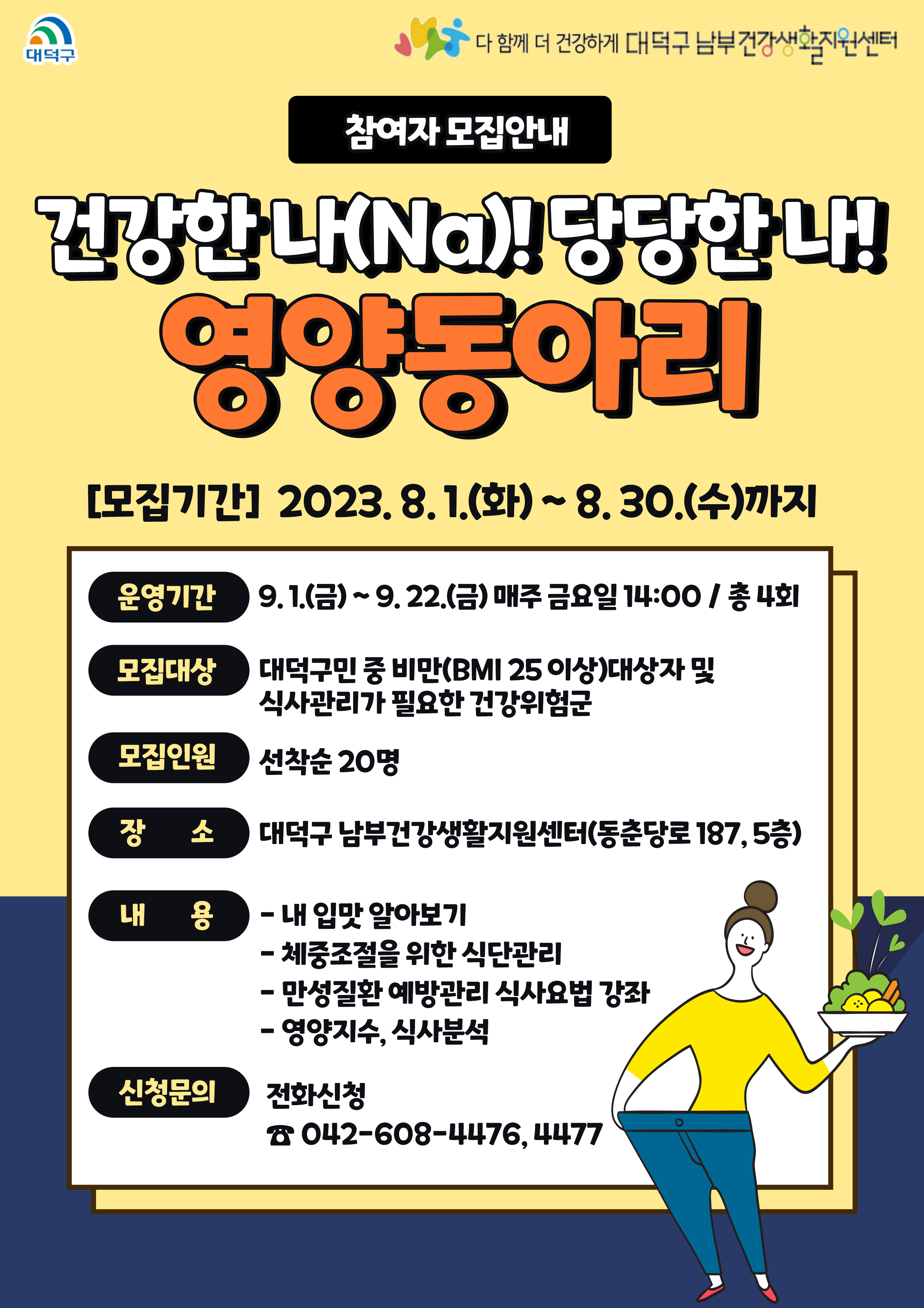 영양동아리(2기) 참여자를 모집합니다. 비만, 고혈압, 당뇨병 등 혼자서 식사관리 하기 어려웠던 분들! 함께 모여서 건강한 식습관 실천을 위한 한걸음을 내디뎌 볼까요? 자세한 사항은 카드뉴스를 확인하시고 신청전화 주세요 전화: 042-608-4476, 4477