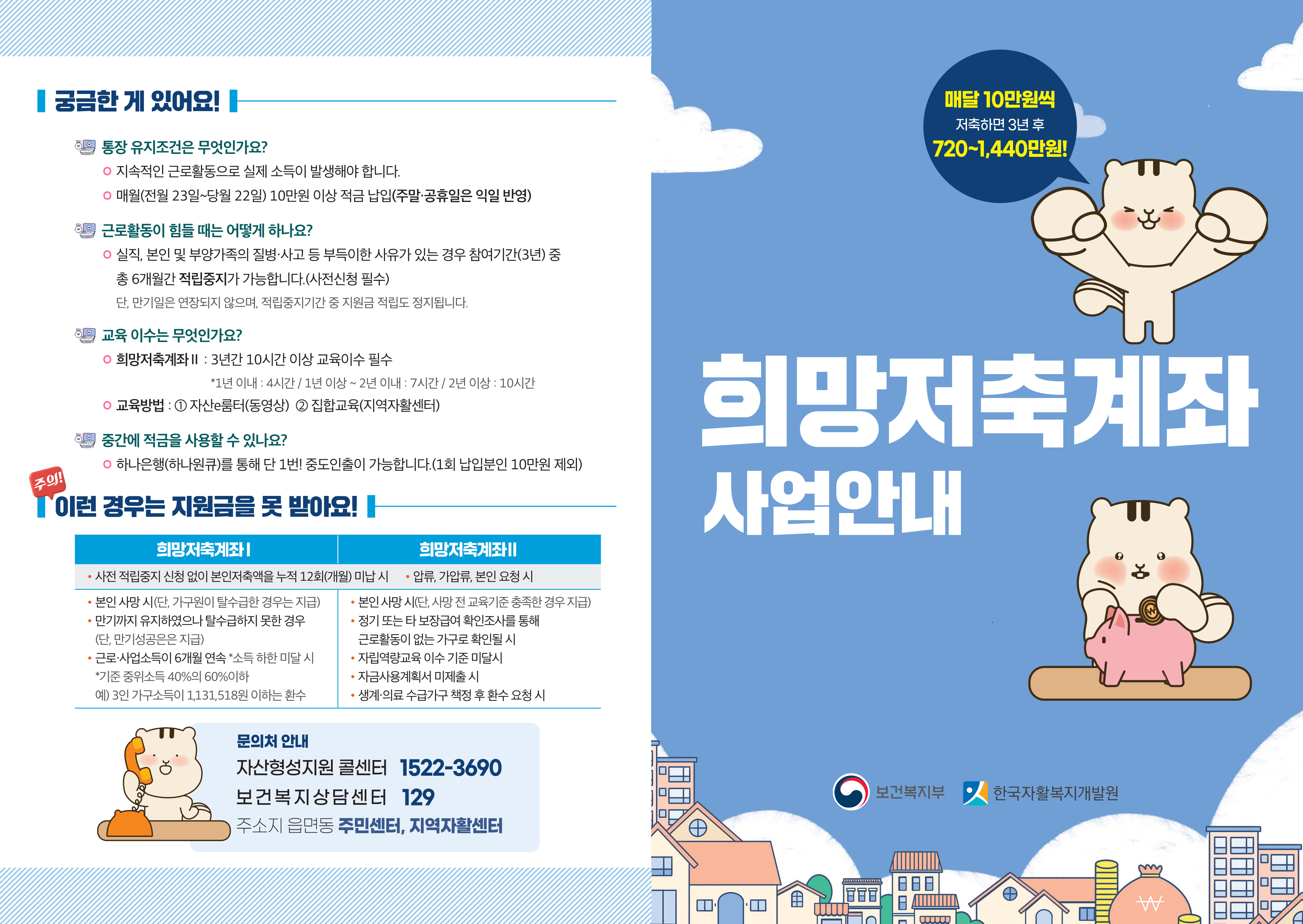 ㅇ 복지서비스명 : 희망저축계좌Ⅰ ㅇ신청 기간 : 2024년 3월 15일(금)까지 ㅇ 신청 대상자 : 일을 하고 있는 사람이 있는 생계·의료급여 수급 가구 ㅇ 정부지원 : 매월 10만원 이상 저축하면 정부지원금 30만원을 매칭 ㅇ 지원내용 - 만기(3년) 시 탈수급한 경우▶ 본인적립금 + 정부지원금 + 추가지원금(해당자) + 이자 - 만기(3년) 시 탈수급을 못한 경우 ▶ 본인적립금 + 정부지원금 누적액의 5% + 이자 ※ 세부 사항은 첨부한 홍보물을 참고해 주세요~ |