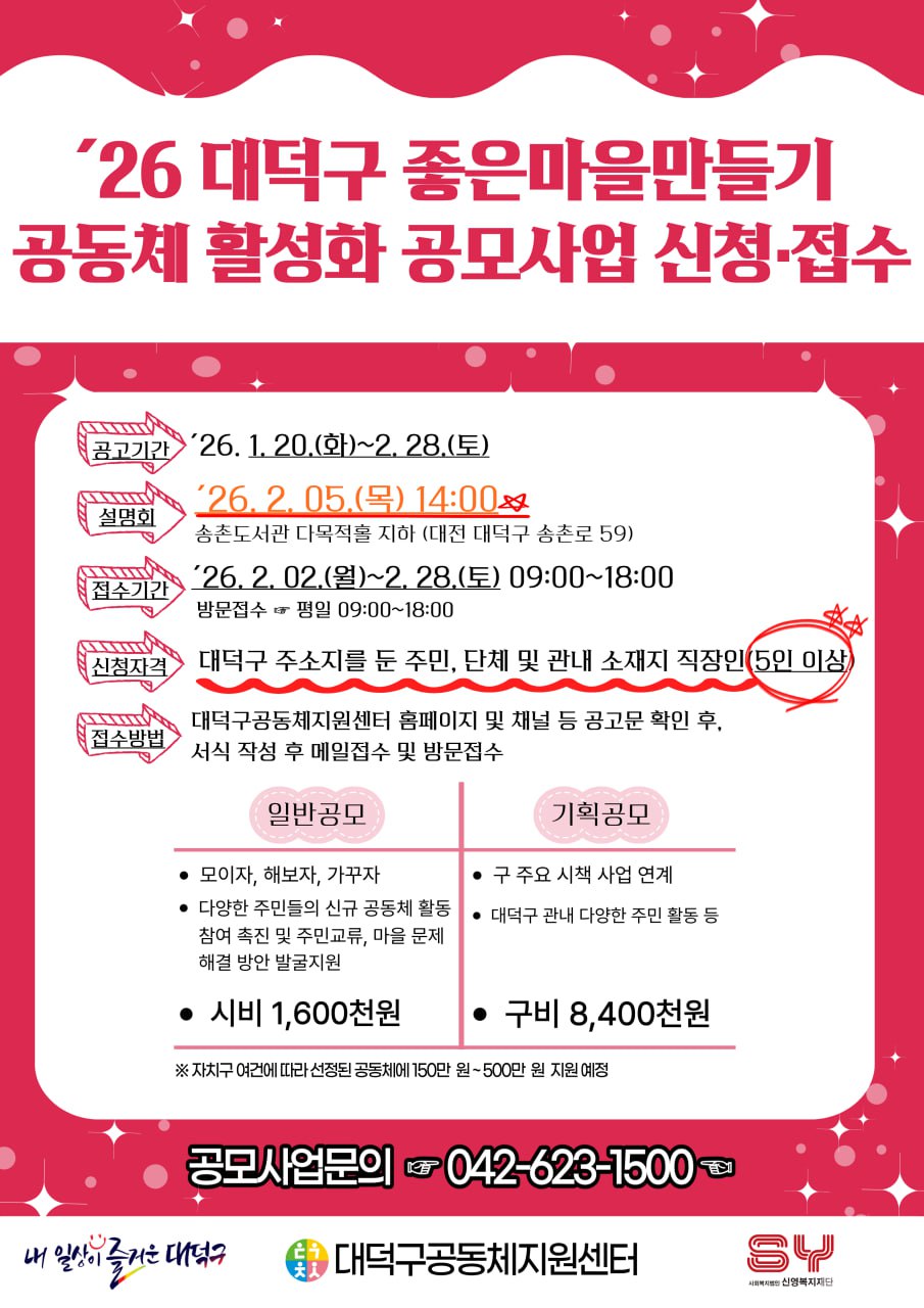 주민이 주도적으로 참여하는 지역공동체 문화 조성을 통해 사회적 자본을 확충하고, 주민 삻의 질 향상에 기여하고자 『2026 대덕구 마을공동체 활성화 공모사업』을 다음과 같이 공고하오니 많은 관심과 참여 바랍니다. 공고명: 2026 대덕구 마을공동체 활성화 공모사업 공고기간: 2026. 1. 20.(화) ~ 2. 28.(토) 서류접수: 2026. 2. 2.(월) ~ 2. 28.(토) / 방문(평일 09:00 ~ 18:00), 이메일 접수 가능 사업주관: 대덕구공동체지원센터 자세한 사항은 첨부파일 참고하시기 바랍니다. |