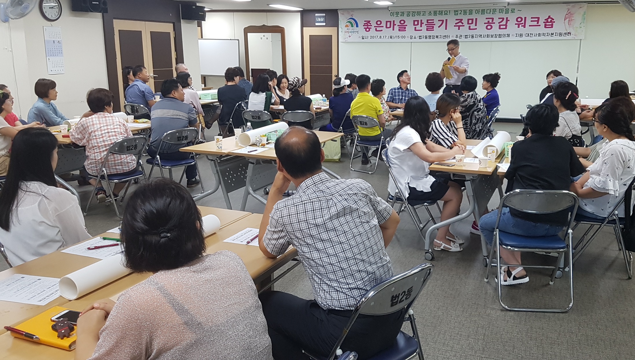 대덕구 법2동, 돌봄과 나눔으로 우리 동네‘좋은 마을 만들기’ 지난 17일 자생단체, 복지관, 동 행정복지센터 등 참여 한마음으로 마을공동체 활성화 위한 주민 공감 워크숍 개최 대전 대덕구 법2동(동장 이재근)에서는 지난 17일 주민자치위원회(위원장 김영신)를 포함한 10개 자생단체와 법동종합사회복지관, 법2동 지역사회보장협의체 등 주민 45명이 참석해 이웃과 공감하고 소통해 법2동을 좋은 마을로 만들기 위해 ‘좋은 마을 만들기 주민 공감 워크숍’을 개최했다. 올해 대전광역시 공동체 활성화 공모사업 중 2차 사업으로 진행된 이날 워크숍에서는 법2동 지역사회보장협의체 주관으로 ‘마을공동체란 무엇인가’, ‘우리 마을의 꼭 해결되어야 할 의제’를 뽑아보고, 이런 의제를 해결하기 위한 ‘마을리더의 역할’에 대해 공유하면서 법2동을 좋은 마을로 만들어 나가기 위한 주민과 기관, 단체들의 공감대를 이끌어 낸 의미 있는 자리였다. 이날 제시된 의제들로는 주민 편의와 상권 활성화를 위한 주차장 부족문제, 동부경찰서 이전 후 비어있는 부지에 대한 신속한 해결, 문화·체육시설 부족 등으로 열띤 토론의 장이 됐다. 김영신 주민자치위원장은 “오늘 워크숍에서 주민들의 다양한 의견을 들어보고 나아가 이웃과 이웃이 함께 우리 법2동을 ‘좋은 마을’로 만들기 위한 공감대를 가질 수 있는 의미 있는 시간이었다”며 “지역의제를 함께 해결하고자 하는 공동체의 첫걸음을 내딛게 된 좋은 계기가 돼 기쁘다”고 소감을 밝혔다. [사진 설명 : 지난 17일 대덕구 법2동에서 열린 ‘좋은 마을 만들기 주민 공감 워크숍’에서 대전사회적자본지원센터 장용석 팀장의 마을공동체에 대한 강의를 듣고 있는 모습] |