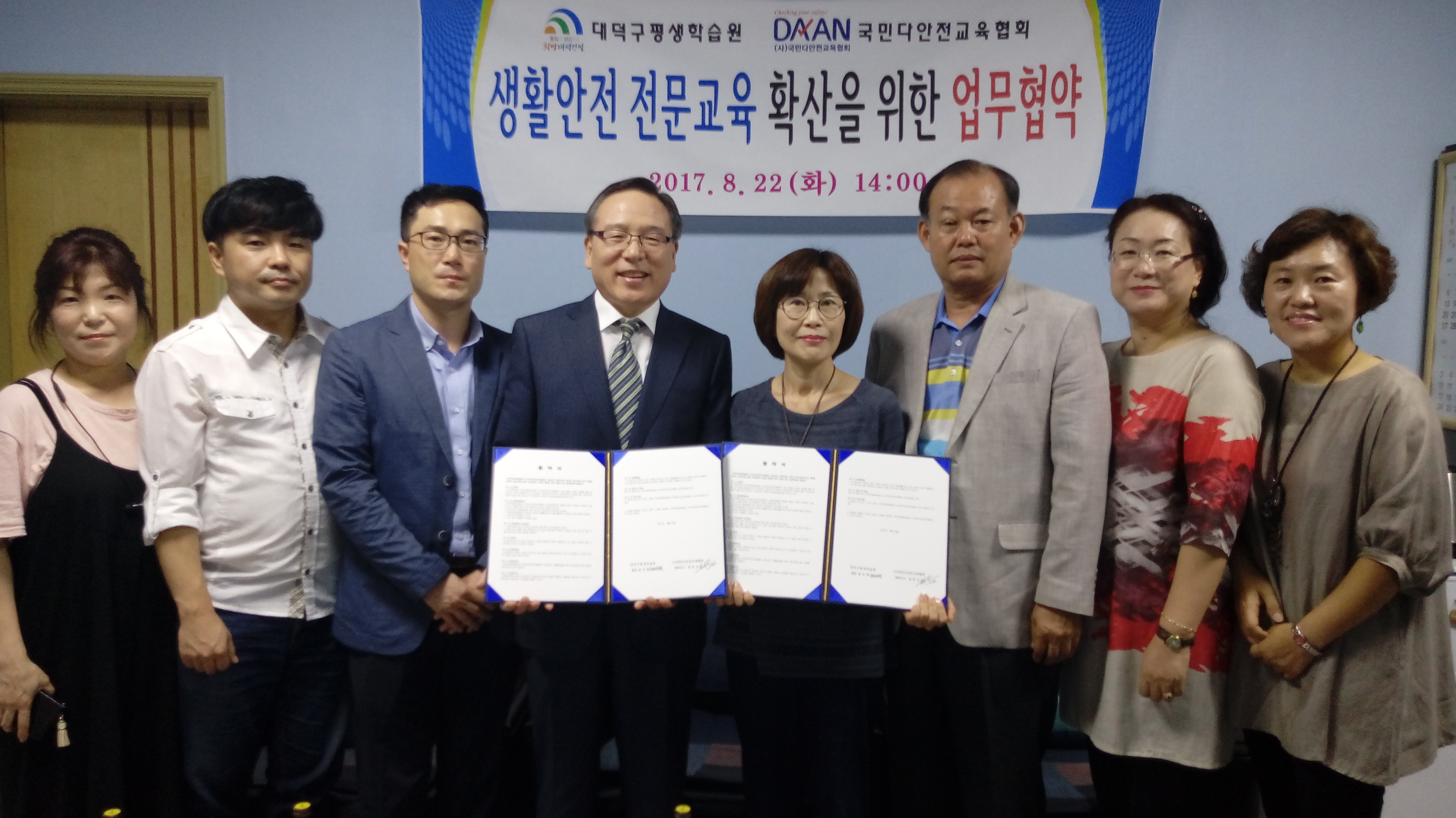 대덕구-국민다안전교육협회, 생활안전 전문교육 확산 업무협약 체결 대덕구(구청장 박수범)는 지난 22일 대덕구평생학습센터에서 사단법인 국민다안전교육협회(대표 최헌규)와 대전 지역의 생활안전 전문교육 확산을 위한 업무협약을 체결했다. 이번 협약을 통해 ▲생활안전분야에 관한 프로그램 개발 및 운영지원 ▲생활안전 전문인력 육성에 따른 지원 및 공동연구개발 ▲대덕구 평생학습원의 생활안전지도사를 활용한 지자체 및 일반기업체 안전교육 등에 관련한 지원 등을 상호 협력해 나가기로 했다. 정여택 평생학습원장은 “이번 협약으로 대덕구가 배출한 생활안전지도사를 통해 행복하고 안전한 도시가 될 수 있도록 최선을 다할 것”이라며 “대덕구 주민뿐만 아니라 나아가 대전 시민 모두가 안전의식을 생활화할 수 있도록 지속적인 협력체계를 구축하겠다”고 말했다. 한편 대덕구 평생학습원은 2014년과 2015년에 걸쳐 ‘대덕구생활안전지도사 양성과정’을 운영해 43명의 생활안전지도사를 배출했으며 현재는 대덕구 생활안전교육 강사로 19명이 활동해 오고 있다. [사진 설명 : 지난 22일 대덕구평생학습센터에서 정여택 평생학습원장(왼쪽부터 다섯 번째)과 사단법인 국민다안전교육협회 최헌규 대표(네 번째)는 생활안전 전문교육 확산을 위한 업무협약을 체결하고 기념촬영을 하고 있다.] |