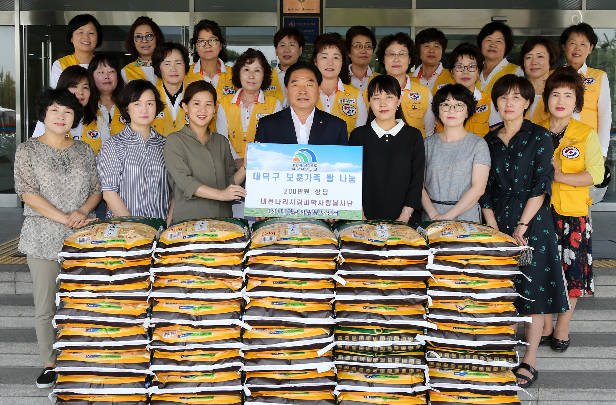나라사랑과학사랑봉사동아리, 저소득 보훈가족 위해 대덕구자원봉사센터에 사랑의 백미 전달 나라사랑과학사랑봉사동아리(회장 김영아)에서는 25일 구청 현관에서 저소득 보훈가족을 위해 써달라며 대덕구자원봉사센터(이사장 박수범) 백미 20kg 50포를 전달했다. 김영아 회장은 “앞으로도 복지사각지대에 있는 저소득 가족을 위해 위문품과 생필품 등 후원 활동을 꾸준히 실천하겠다”고 말했다. 이번에 후원된 백미는 추석 명절을 맞아 저소득 보훈가족 50여명에게 대한적십자사대덕구협의회 회원들이 직접 전달할 계획이다. |