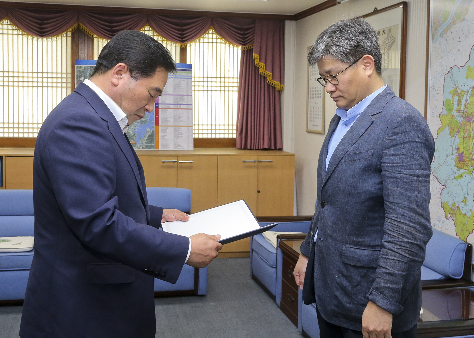 대웅한의원 전기석 원장, 사회복지유공 보건복지부장관상 수상 대전 대덕구 중리동에 위치한 대웅한의원 전기석 원장이 제18회 사회복지의 날 사회복지유공 보건복지부장관상을 수상했다. 대웅한의원 전기석 원장은 그 동안 중리동 지역사회보장협의체 위원장으로 활동하면서 대덕구 관내 저소득 주민을 위해 10여 년 동안 무료 한방진료 등 어렵고 힘든 이웃을 위해 헌신 봉사한 공을 인정받아 수상자로 선정됐다. [사진 설명 : 박수범 대덕구청장(왼쪽)은 12일 구민의 사랑방에서 대웅한의원 전기석 원장(오른쪽)에게 보건복지부장관상을 전달하고 있다.] |