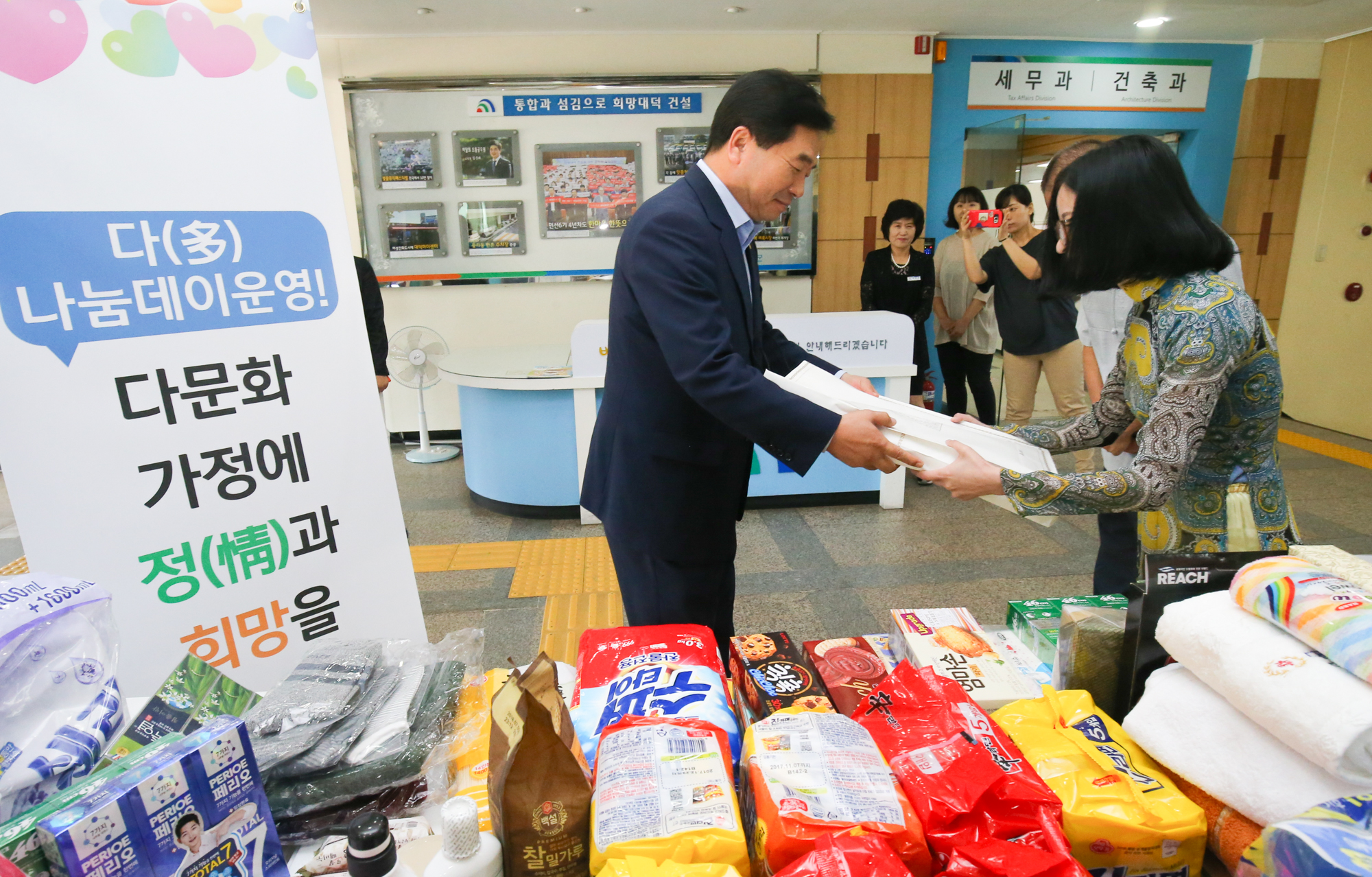 대덕구, 다문화가정 위한‘다(多) 나눔데이’운영 다문화가정 국제특급우편요금 지원 대상자를 위한 모국에 보낼 물품 모집 구청 모든 직원 다문화가정을 위한 나눔 참여 대전 대덕구(구청장 박수범)는 13일 다문화가정을 위한 나눔 문화 확산을 위해 구청 직원 등을 대상으로 가정 내 사용하지 않은 생활용품을 모집하는 ‘다(多) 나눔데이’를 운영해 500여만 원 상당의 물품을 기부 받았다. ‘다 나눔데이’는 지난해와 올해 상반기에 이어 세 번째 갖는 행사로, 다문화가정 국제특급우편요금 지원 대상자를 위한 기부물품을 모집해 국제특급우편 발송 시 한국의 정(情)을 모국의 가족에게 국제특급우편으로 발송할 예정이다. 다문화가정 국제특급우편요금 지원은 대전광역시에서 처음으로 실시한 다문화가정 복지시책으로 모국의 가족에게 택배를 보내고 싶어도 비싼 요금으로 인해 택배를 보내지 못하는 다문화가정의 어려움을 해소하고, 아울러 택배에 보낼 물건이 부족한 가정을 위해 생활용품 기부 받아 진정한 나눔을 실천해 오고 있다. 구는 2016년부터 2017년 상반기까지 다문화가정 121세대에 국제특급우편(EMS)요금을 지원했고, 구 직원과 지역사회로부터 기부 받은 1000여만 원 상당 물품을 국제특급우편 발송 시 참여한 다문화가정에 분배했다. 향후 다문화가정 국제특급우편요금 지원 업무 협약을 맺은 구와 대전대덕우체국, 대덕구다문화가족지원센터가 협력해 국제특급우편 발송을 추진할 예정으로, 구에서는 국제특급우편요금을 지원하고, 대전대덕우체국에서는 다문화가정의 접근성을 고려하여 출장 접수 처리 및 포장을 위한 용품을 지원하고, 대덕구다문화가족지원센터에서는 자체 모집한 기부물품을 다문화가정에 추가로 지원할 예정이다. 박수범 대덕구청장은 “다문화가정을 위한 나눔 문화가 지역사회에 더욱 확산되기를 바란다”며 “함께 살아가는 동반자로 다문화가정을 인식하고, 다문화가정은 건강하게 정착해 우리 사회 주축이 되어주길 바란다”고 말했다. [사진 설명 : 박수범 대덕구청장(왼쪽)은 13일 구청 1층 현관에서 ‘다 나눔데이’ 운영으로 모아진 500여만 원 상당의 물품을 베트남 결혼이주여성 허윤정 씨(오른쪽)에게 전달하고 있다.] |