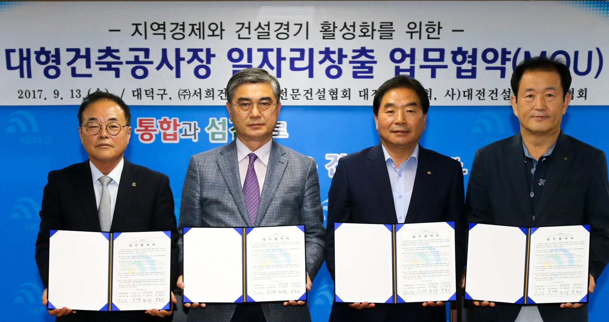 대덕구, (주)서희건설과 지역경제 살리기에 맞손 대전 대덕구(구청장 박수범)는 지난 13일 오후 대형건설업체인 ㈜서희건설(대표 곽성기)과 손을 잡고 지역경제 살리기와 일자리 창출을 위한 업무협약(MOU)을 체결했다. 이날 협약식에서는 석봉동에 위치한 옛 쌍용양회 부지 내 아파트 건립 시공사인 ㈜서희건설 윤여공 부사장, 대한전문건설협회 대전광역시지회 정인수 회장 , 사단법인 대전건설건축자재협회 박동서 회장이 참석해 손잡고 뜻을 함께 했다. ㈜서희건설에서는 대전지역 전문건설업체의 하도급 참여와 인력 및 자재 장비 등을 우선 사용하고 지역 음식점 이용에도 적극 협조하기로 했다. 그리고 대전전문건설협회에서는 하도급 건설사의 견실시공을 유도해 공사 품질 향상을 도모하고, 사단법인 대전건설건축자재협회에서는 지역생산 우수자재를 발굴하여 건축현장에 공급함으로 건설기술 향상에 노력하기로 했다. 이로 인해 지역 주민들이 참여하는 일자리가 늘어나고 주변 상가 골목상권 활성화에 기여할 수 있을 것으로 기대된다. 박수범 대덕구청장은 “원활한 공사 추진을 위해 행정지원과 공사 관련 현안사항 해결에 적극 협조하겠다”며 “앞으로도 대형공사장에 상생협약을 계속 추진해 일자리 창출과 지역경제 살리기에 최선을 다하겠다”고 강조했다. [사진 설명 : 박수범 대덕구청장(왼쪽부터 세 번째)은 지난 13일 오후 구청 소회의실에서 대한전문건설협회 대전광역시지회 정인수 회장(첫 번째), ㈜서희건설 윤여공 부사장(두 번째), 사단법인 대전건설건축자재협회 박동서 회장(네 번째)과 대형건축공사장 일자리 창출을 위한 업무협약을 맺고 기념촬영을 하고 있다.] |
