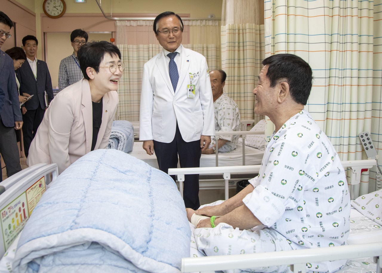 국가유공자 여러분의 빠른 쾌유와 건강을 기원합니다. 호국보훈의 달 맞아 보훈병원 입원환자 위문, 위문품 전달 대덕구(구청장 박정현)가 6월 ‘호국보훈의 달’을 맞이하여 나라를 위해 희생한 선열들의 숭고한 희생정신을 기리고 감사의 마음을 전했다. 대덕구는 13일 대전보훈병원을 찾아 국가유공자와 유족을 위문?격려하고 위문품을 전달했다고 밝혔다. 이날 박정현 구청장은 국가유공자가 입원 중인 병실을 들러 “여러분들의 희생으로 대한민국의 발전이 있었다”며 감사의 말을 전했다. 아울러 “국가를 위한 유공자들의 희생의 의미를 되새기며 국가의 소중함을 인식하는 것은 우리가 지켜야 할 가치이자 다음 세대에 전해야 할 정신적 유산이다”고 하였다. 이어 “호국은 우리 모두의 의무이며 보훈은 살아있는 사람의 책임”이라며 “입원하신 국가유공자들이 불편함이 없도록 최선을 다해 치료해 주기 바란다”고 병원관계자에게 당부했다. 한편, 대전보훈병원은 현재 약 390개의 병상을 갖추고 국가유공자와 유가족, 참전군에 대한 진료를 전담으로 하고 있으며, 약 340여명의 국가유공자와 유가족 등이 입원치료를 받고 있다. |
