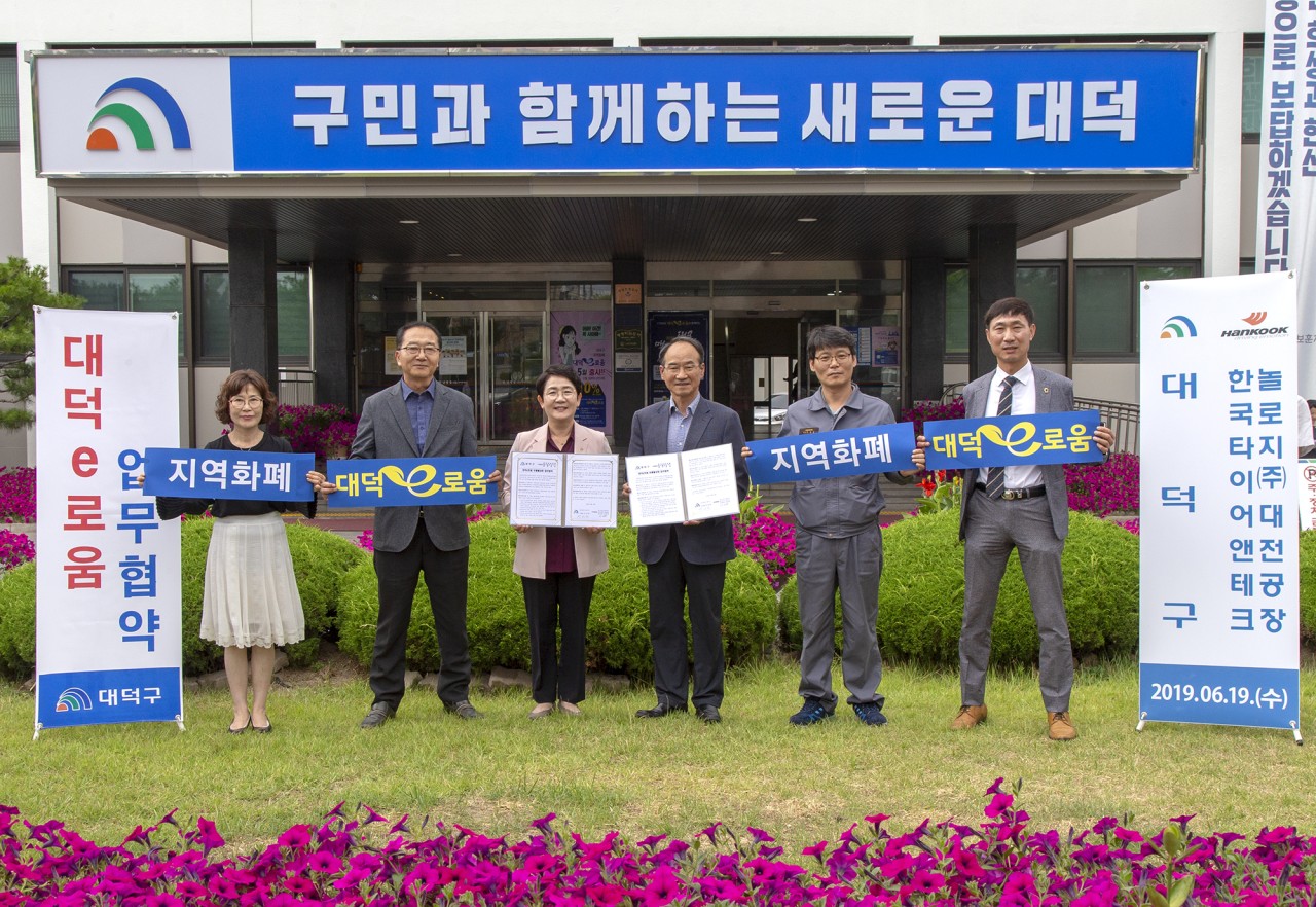 타이어업계 세계 7위 한국타이어앤테크놀로지(주), 대덕e로움과 손잡아 대덕구, 19일 한국타이어앤테크놀로지(주) 대전공장과 유통활성화 업무협약 체결 대덕구(구청장 박정현)는 19일 구청 사랑방에서 오는 7월 5일 출시하는 지역화폐 대덕e로움 유통활성화를 위해 한국타이어앤테크놀로지(주) 대전공장(공장장 윤정록)과 업무협약을 체결했다. 이번 협약은 3천명의 직원을 둔 대덕산업단지 최대 기업이자, 타이어 매출 세계 7위의 글로벌기업이 지역경제를 살리기 위해 직접 나섰다는데 의미가 있다. 협약체결에 따라 한국타이어앤테크놀로지(주) 대전공장은 소속 직원들이 대덕e로움을 적극 구매해 사용할 수 있도록 협력하고, 회사 운영비의 일정 부분도 대덕e로움을 사용해 지출하게 된다. 한국타이어앤테크놀로지(주) 대전공장은 대덕구 목상동에 소재하고 있으며 연간 1700만 개의 타이어를 생산하는 국내 최대의 타이어 생산공장이다. 윤정록 공장장은 “40년을 넘게 대덕산업단지에 뿌리를 내린 우리 공장은 대덕구 향토기업이라 할 수 있다.”면서, “글로벌 기업이지만 향토기업으로서 지역경제에도 도움을 드리는 것은 당연하기에, 대덕e로움 사용을 적극 홍보하는 한편 구매에도 앞장 설 것”이라고 말했다. 박정현 구청장은“대한민국을 대표하는 세계적 기업 한국타이어앤테크놀로지(주)가 대덕e로움 유통활성화를 위해 앞장 서 준 것에 감사드린다.”면서, “이번 협약을 계기로 지역경제 발전은 물론 양 기관이 상생 발전할 수 있는 다양한 방안을 찾아 협력해 나갈 것”이라고 말했다. 대전시 자치구 중 최초로 도입하는 지역화폐 대덕e로움은 쓰면 쓸수록 지역경제에 이로운 영향을 주는 지역화폐라는 의미로, 오는 7월 5일 출시되며 50억원 규모로 발행된다. 환전차익거래(일명 깡) 문제 해소와 가맹점 모집 편의성을 고려해 종이 상품권이 아닌 전자카드 형태로 발행되고, 상시 6%, 출시·명절 등 특판 시 10%의 할인을 받아 구매할 수 있다. 또한 IC카드 단말기를 사용하는 모든 점포에서 사용 가능하지만 대형할인마트·유흥업소 등은 제외된다. |