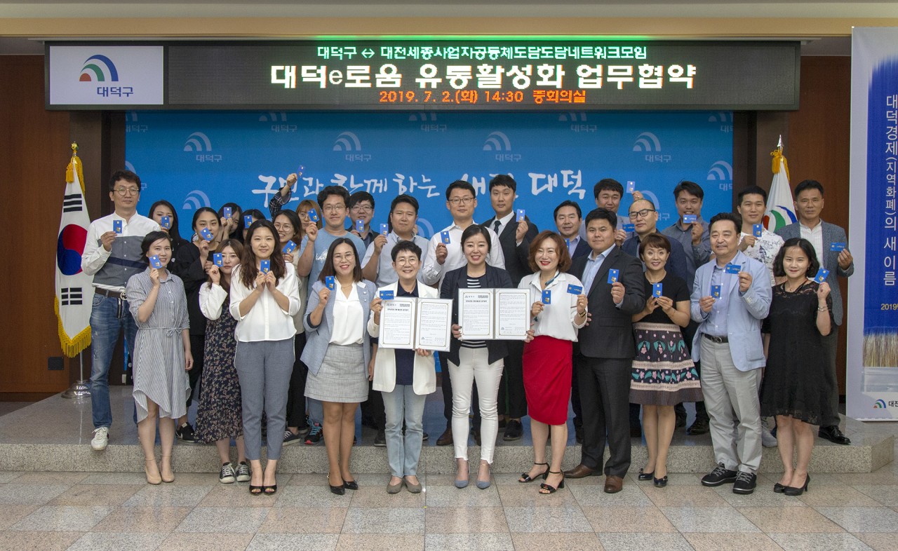 대전·세종 사업장 대표 250명, 대덕e로움 유통활성화 동참 대덕구, 2일 대전세종사업자공동체 도담도담네트워크와 업무협약 체결 대덕구(구청장 박정현)는 2일 구청 중회의실에서 지역화폐 대덕e로움 유통활성화를 위해 대전·세종 사업자공동체 도담도담네트워크(대표 이서진, 이하 도담도담네트워크)와 업무협약을 체결했다. 이번 협약은 대전·세종에 사업장을 둔 대표들이 지역경제 살리기운동의 일환으로 업무협약을 체결하게 되었으며, 협약체결에 따라 도담도담네트워크는 소속 회원들이 대덕e로움을 적극 구매해 사용하고 홍보하는 한편, 상생발전을 위해 앞으로도 다양한 경제살리기 활동을 대덕구와 함께 하게 된다. 이서진 대표는 “대전시 최초로 출시하는 지역화폐 대덕e로움이 성공적으로 안착해야 대전경제, 나아가 대한민국 경제가 사는 지름길”이라면서,“대덕e로움이 성공적으로 정착될 수 있도록 최선을 다해 홍보하는 한편, 구매에도 앞장설 것”이라고 말했다. 박정현 구청장은“대덕e로움 출시에 맞춰 대전·세종에서 사업하는 250명의 대표들로 구성된 도담도담네트워크가 대덕e로움 유통활성화를 위해 손잡아 준 것은, 그 자체로도 큰 힘이 된다.”면서, “지역주민 뿐만 아니라 대전·세종 시민 모두가 대덕e로움을 사용해 대덕구 경제가 활력을 찾고 새로운 역사를 만들어 갈 수 있도록 앞으로도 힘을 모아 갈 것”이라고 말했다. 대전시 자치구 중 최초로 도입하는 지역화폐 대덕e로움은 쓰면 쓸수록 지역경제에 이로운 영향을 주는 지역화폐라는 의미로, 7월 2일부터 사전출시 되었으며 50억원 규모로 발행된다. 환전차익거래(일명 깡) 문제 해소와 가맹점 모집 편의성을 고려해 종이 상품권이 아닌 전자카드 형태로 발행되고, 상시 6%, 출시·명절 등 특판 시 10%의 할인을 받아 구매할 수 있다. 또한 IC카드 단말기를 사용하는 모든 점포에서 사용 가능하지만 대형할인마트·유흥업소 등은 제외된다. |