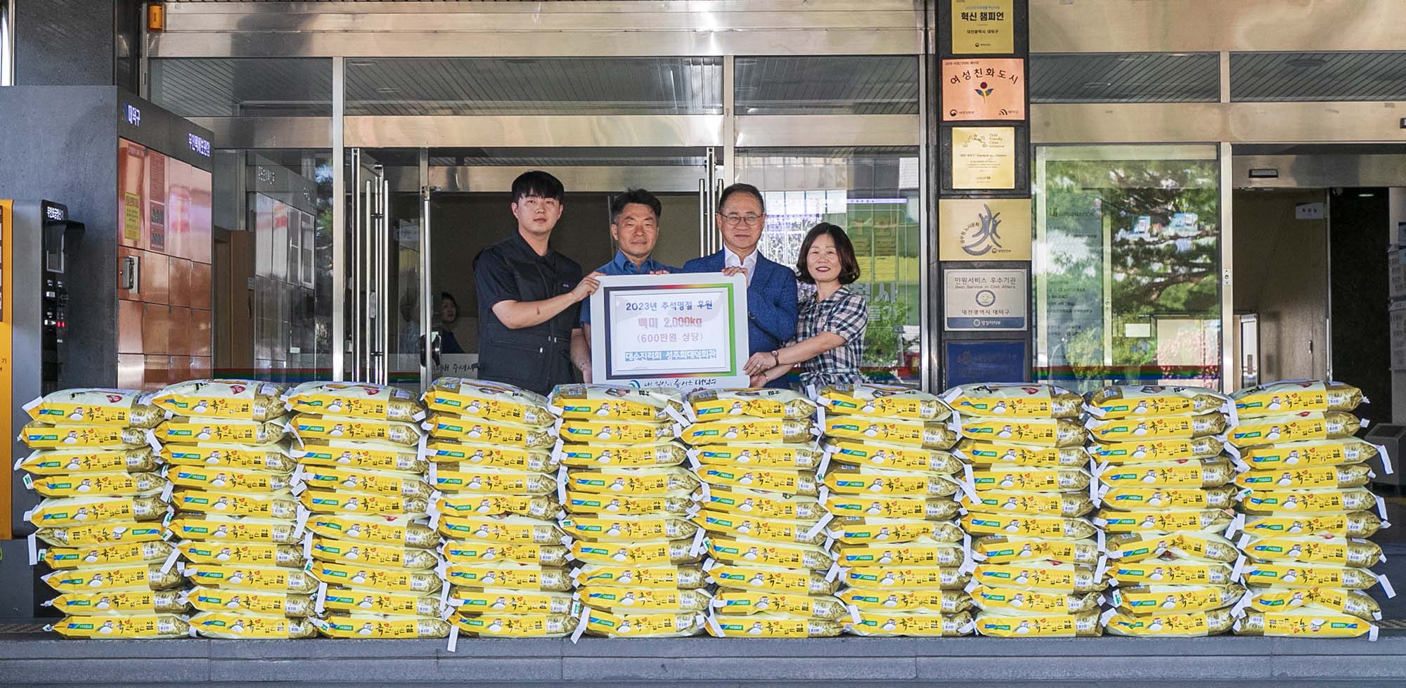 대순진리회성주회 대덕회관, 대전 대덕구에 추석 명절 백미 후원 대전 대덕구(구청장 최충규)는 추석 명절을 맞아 대순진리회성주회 대덕회관으로부터 600만원 상당의 백미 10kg 200포를 전달받았다고 밝혔다. 7일 대덕구에 따르면 대순진리회성주회 대덕회관은 20여년 째 매년 설과 추석 명절마다 백미 후원을 이어오며 따뜻한 나눔을 실천하고 있다. 구는 기탁받은 백미를 12개 동 행정복지센터에 배부해 중위소득 100% 이하 저소득 취약계층 177세대를 지원하고, 전몰군경 미망인회 대덕구지회에 23포를 지원할 계획이다. 안대헌 선감은 “기부를 통한 작은 정성이 지역사회 소외계층에게 전해져 풍요로운 추석 명절이 되시길 기원한다”며 “앞으로도 지속적인 나눔활동을 통해 이웃사랑을 실천해 나가겠다”고 말했다. 최충규 대덕구청장은 “지역의 어려운 이웃들을 위해 후원해주신 대순진리회성주회 대덕회관에 감사드린다”며 “구민 모두가 행복한 추석 명절을 보낼 수 있도록 위기가구 발굴 및 지원에 앞장서겠다”고 말했다. [사진 설명 : 안대헌(사진 왼쪽 두 번째) 대순진리회성주회 대덕회관 선감이 추석 명절을 맞아 어려운 이웃을 돕기 위한 백미를 전달한 후 기념 촬영을 하고 있다.] |