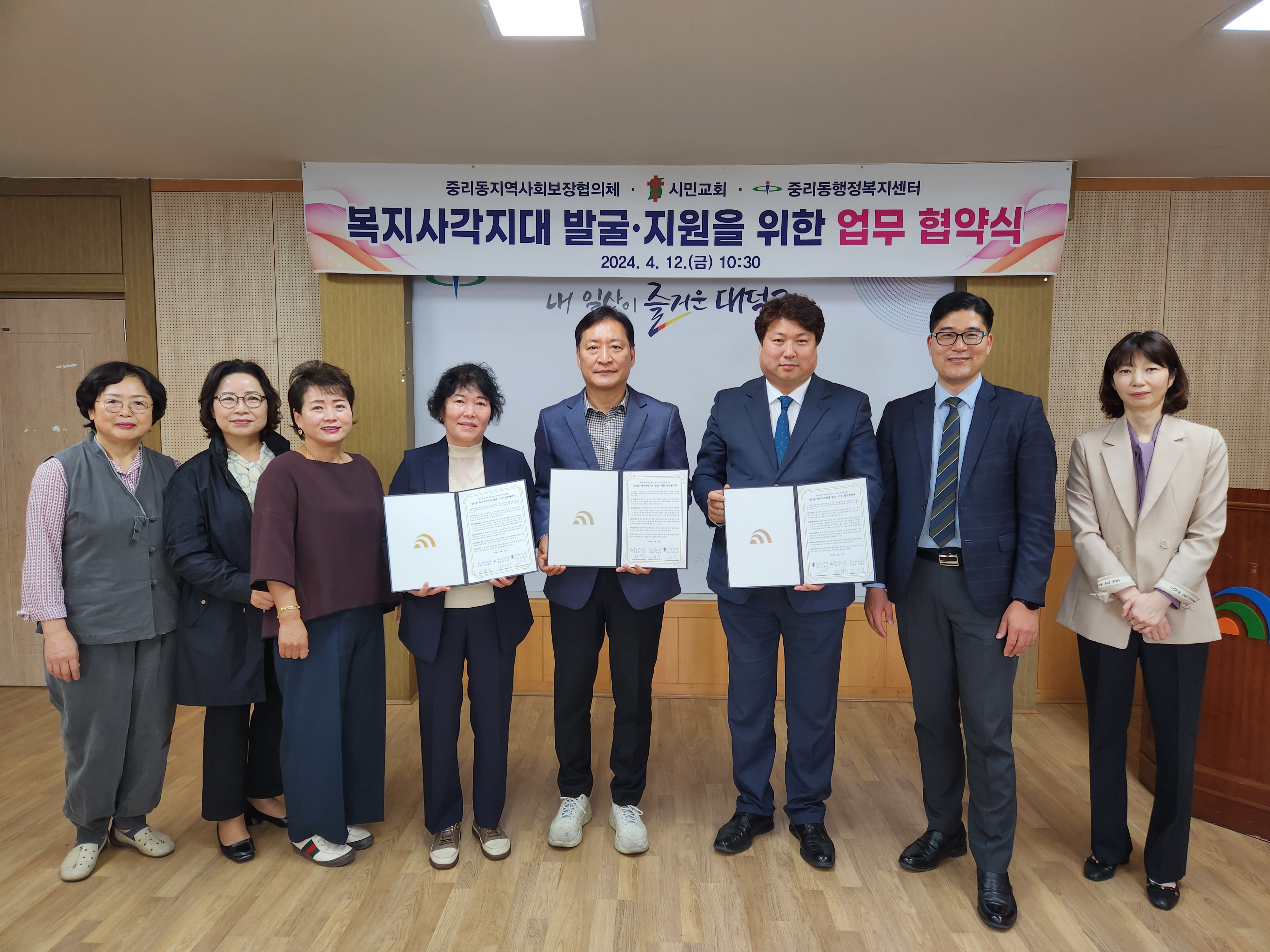 대전 대덕구 중리동, 민관 협력 복지 사각지대 지원 ‘맞손’ 중리동지역사회보장협의체·시민교회와 지역 사회적 약자 발굴 등 업무협약 체결 대전 대덕구(구청장 최충규) 중리동은 지역의 복지 사각지대 발굴을 위해 민관 협력체계 구축에 나섰다고 밝혔다. 중리동에 따르면 동은 중리동 지역사회보장협의체(위원장 임명숙), 시민교회(목사 김동국)와 업무협약을 체결했다고 밝혔다. 이번 협약을 통해 중리동 지역사회보장협의체와 시민교회는 중리동의 사회적 약자를 발굴하고 지원하기 위한 협력 및 지원 체계를 구축할 예정이다. 김동국 시민교회 목사는 “교회의 역할과 목회 활동이 이번 협약과 일치한다. 지역의 어려운 이웃을 돕기 위한 활동에 힘을 보태겠다”라고 전했다. 임명숙 중리동 지역사회보장협의체 위원장은 “시민교회와 중리동 지역사회보장협의체의 협력을 통해 더 많은 이웃을 도울 수 있을 것으로 기대된다”라며 “앞으로도 지역사회를 위한 다양한 활동을 이어가겠다”라고 밝혔다. 전기원 중리동장은 “중리동의 취약계층을 위해 민·관 협력이 중요하다”라며 “촘촘한 복지 울타리를 만들기 위해 중리동도 최선을 다하겠다”라고 말했다. [사진 설명 : 임명숙 중리동 지역사회보장협의체 위원장(사진 왼쪽 네 번째), 전기원 중리동장(사진 왼쪽 다섯 번째), 김동국 시민교회 목사(사진 왼쪽 여섯 번째)가 중리동 복지 사각지대 발굴을 위한 업무협약을 맺은 후 기념 촬영을 하고 있다.] |