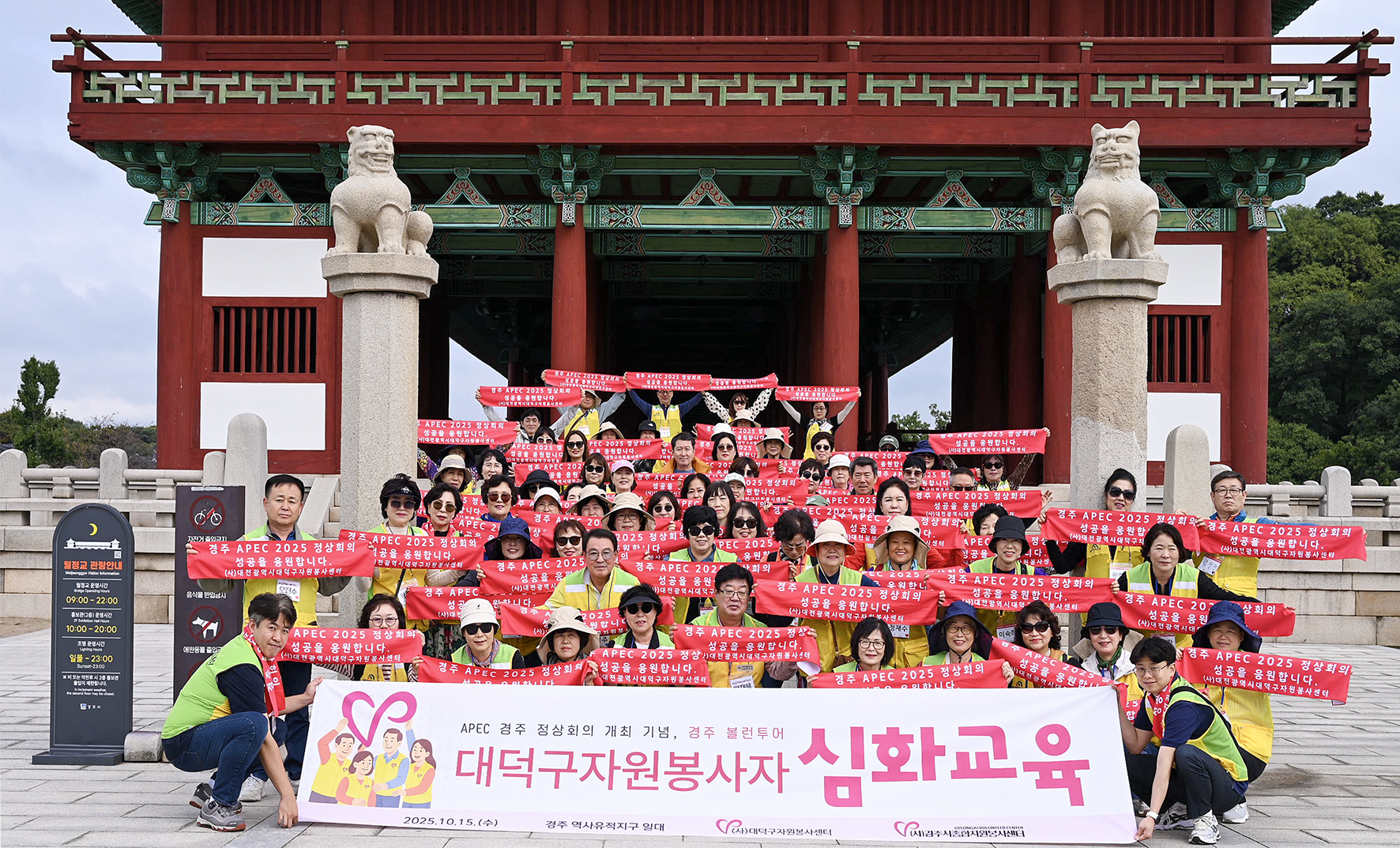 (사)대덕구자원봉사센터, APEC 정상회의 홍보 자원봉사 활동 전개 지역 자원봉사자 70명 참여… 경주시종합자원봉사센터 연계 ‘볼런투어’ 운영 대전 대덕구(구청장 최충규)는 (사)대덕구자원봉사센터(이사장 박재용)가 15일 자원봉사자 70명과 함께 ‘2025 APEC 정상회의’ 성공 개최를 기원하는 홍보 자원봉사 활동을 펼쳤다고 밝혔다. 이번 활동은 자원봉사 역량을 높이기 위한 심화 교육 프로그램의 하나로, (사)경주시종합자원봉사센터와 연계해 ‘볼런투어(Volunteer+Tour)’ 방식으로 진행됐다. 자원봉사자들은 이날 경주의 대표 관광지인 △월정교 △최씨고택 △경주향교 △첨성대 등 경주의 주요 관광지를 순회하며 방문객에게 2025 APEC 정상회의 유치 홍보 캠페인을 전개했다. 동시에 전문 해설과 함께 지역의 역사와 문화를 배우는 시간을 가지며 봉사와 학습, 힐링을 함께하는 의미 있는 교류 활동을 펼쳤다. 박재용 (사)대덕구자원봉사센터 이사장은 “봉사와 여행을 결합한 뜻깊은 프로그램을 지원해주신 (사)경주시종합자원봉사센터에 감사드린다”며 “자원봉사자들이 활동의 보람뿐 아니라 휴식의 기회도 함께 얻는 소중한 시간이었다”고 말했다. 최충규 대덕구청장은 “우리 사회 곳곳에서 언제나 헌신해주시는 자원봉사자 여러분께 깊은 감사의 말씀을 드린다”며 “앞으로도 자원봉사 가치 확산과 활동 기반 조성을 위해 다양한 교류와 지원을 이어가겠다”고 밝혔다. [사진 설명(1) : 대덕구 자원봉사자들이 15일 경주 월정교 일원에서 ‘2025 APEC 정상회의’ 성공 개최를 기원하는 홍보 자원봉사 활동을 마친 후 플래카드를 들고 기념 촬영을 하고 있다.] [사진 설명(2) : 대덕구 자원봉사자가 15일 경주 역사유적지구 일원에서 2025 APEC 정상회의 유치 홍보 캠페인을 진행하고 있다.] |