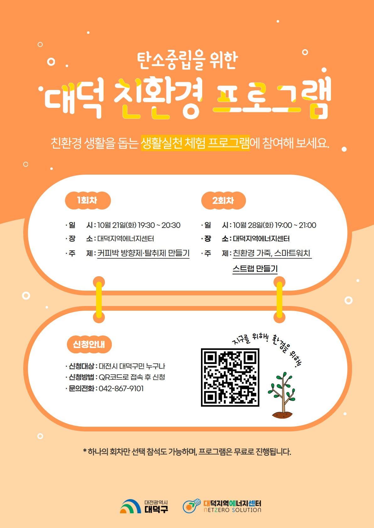 대전 대덕구, ‘커피박·친환경 가죽 활용’ 친환경 체험 프로그램 운영 오는 21일 ‘커피 찌꺼기 방향제·탈취제’·30일 ‘스마트워치 가죽 스트랩’ 제작 생활 속 자원순환 통해 탄소중립 실천 확산… 대덕구민 누구나 무료 신청 가능 대전 대덕구(구청장 최충규)는 일상에서 손쉽게 실천할 수 있는 친환경 생활문화를 확산하기 위해 오는 11월까지 매월 체험형 프로그램을 운영하고 있다고 밝혔다. 이번 체험형 프로그램은 탄소중립·재활용·업사이클링 등 생활 밀착 주제로 구성해 주민들이 자연스럽게 환경 실천을 익히도록 한 것이 특징이다. 10월 프로그램은 두 차례 진행된다. 21일에는 카페에서 나온 커피박(커피 찌꺼기)을 활용해 방향제·탈취제를 만드는 업사이클링 체험을, 30일에는 친환경 가죽을 사용해 스마트워치 스트랩을 제작하는 시간을 마련했다. 특히, 커피박 재활용은 생활폐기물 감량과 자원순환의 의미를 체험하고, 가죽 스트랩 제작은 지속가능한 소재 활용의 가치를 배우는 기회가 될 전망이다. 참여는 대덕구민 누구나 무료로 가능하며, 자세한 일정과 장소는 홍보 포스터의 QR코드에서 확인 가능하다. 최충규 대덕구청장은 “작은 실천이 모여 큰 변화를 만든다”며 “주민 참여형 탄소중립 정책을 지속 확대해 생활 속 친환경 문화를 뿌리내리겠다”고 말했다. [사진 설명 : 탄소중립을 위한 대덕 친환경 10월 프로그램 홍보 포스터] |