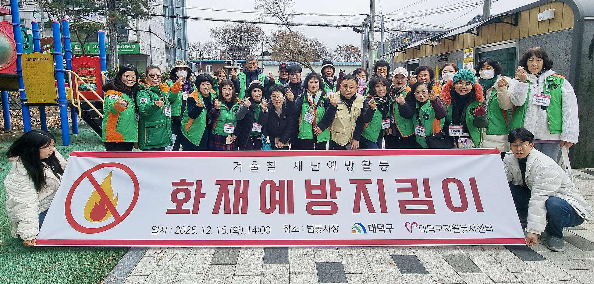 (사)대덕구자원봉사센터, 법동시장서 화재예방지킴이 활동 전개 노후 콘센트 교체·소화기 비치·행동요령 교육 등 화재 사전 차단 대전 대덕구(구청장 최충규)는 (사)대덕구자원봉사센터(이사장 박재용)가 16일 법동시장 일대 점포를 대상으로 ‘화재예방지킴이’ 활동을 전개했다고 밝혔다. 이날 활동은 안전교육, 점포 방문 및 안전점검 순으로 진행됐으며, 특히 안전점검은 △노후 멀티콘센트 교체 △콘센트용 소화패치 부착 △분사형 캔 소화기 비치 등 실질적인 예방 조치가 이뤄졌다. 박재용 대덕구자원봉사센터 이사장은 “전통시장은 화재 발생 시 피해 규모가 큰 만큼 예방이 가장 중요하다”며 “상인들이 안심하고 영업할 수 있도록 지속적인 안전 활동을 이어가겠다”고 말했다. 최충규 대덕구청장은 “현장에서 묵묵히 안전을 지켜주신 자원봉사자들께 감사드린다”며 “대덕구도 전통시장 안전 강화를 적극 지원하겠다”고 전했다. 한편, 대덕구자원봉사센터는 계절별 재난 위험에 맞춰 예방활동을 지속해 왔으며, 지난해 오정동 주택가에 이어 올해는 법동시장에서 화재 예방 활동을 진행했다. [사진 설명 : 대전 대덕구자원봉사센터 자원봉사자들이 16일 대덕구 법동시장 일대 점포를 대상으로 ‘화재예방지킴이’ 활동을 마친 후 기념 촬영을 하고 있다.] |