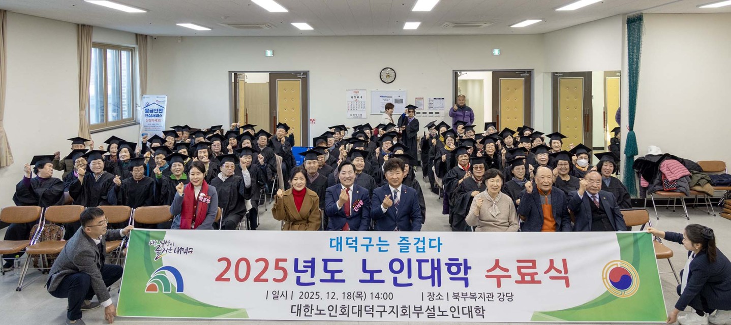 “배움에는 나이가 없습니다” 대전 대덕구, 청춘 대학 수료식 개최 어르신 80명, 평생학습 여정 마무리… 노인 교육·사회참여 확대 기반 다져 대전 대덕구(구청장 최충규)는 18일 대한노인회 대덕구지회에서 ‘2025년 노인대학 수료식’을 열고, 교육과정을 이수한 어르신 80명을 축하했다. 이날 수료식에는 어르신들을 비롯해 대한노인회 대덕구지회 관계자, 지역 어르신, 내빈 등이 참석했으며 수료증 수여와 개근상 표창, 축하 인사 순으로 진행됐다. 대덕구 노인대학은 어르신들의 평생학습 기회를 확대하고 사회참여를 활성화하기 위해 노래 교실, 건강 체조, 외부 전문강사 초청 특강 등 체계적인 교육 프로그램을 운영해 왔다. 참여 어르신들은 정기적인 교육을 통해 배움의 즐거움을 나누고, 이웃과 정서적 교류를 병행하며 건강한 노후 생활을 실천했다 최충규 대덕구청장은 “배움은 어르신들의 삶을 더욱 활기차고 의미 있게 만드는 원동력”이라며 “앞으로도 어르신들이 지속적으로 배우고 사회와 소통할 수 있도록 다양한 노인복지와 평생교육을 적극 지원하겠다”고 말했다. 한편, 대덕구는 앞으로도 대한노인회 대덕구지회와 협력해 어르신 맞춤형 교육 프로그램을 확대하고, 건강하고 존중받는 노후 환경 조성에 앞장설 예정이다. [사진 설명 : 최충규 대덕구청장(사진 첫 번째 줄 왼쪽 네번째)과 노인대학 참여 어르신 및 관계자들이 18일 수료식을 마친 후 기념 촬영을 하고 있다.] |